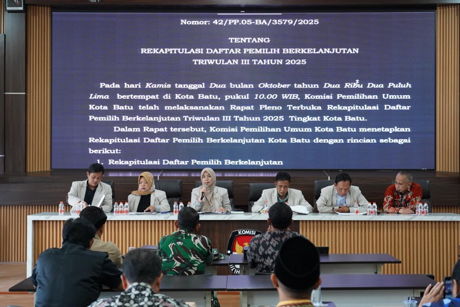 Sesuai pleno, hasil rekapitulasi PDPB Triwulan III Tahun 2025 adalah sebagai berikut, pemilih di Kecamatan Batu sebanyak 78.131 dengan rincian 38.761 laki-laki dan 39.370 perempuan; Kecamatan Bumiaji sebanyak 49.819 dengan rincian 24.961 laki-laki dan 24.858 perempuan; Kecamatan Junrejo sebanyak 42.686 dengan rincian 20.847 laki-laki dan 21.839 perempuan.