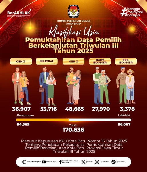 Batu, kota-batu.kpu.go.id - Berikut adalah rekapitulasi Pemutakhiran Data Pemilih Berkelanjutan Kota Batu berdasarkan klasifikasi usia/generasi. Klasifikasi ini merujuk pada hasil Rapat Pleno Terbuka Rekapitulasi Pemutakhiran Daftar Pemilih Berkelanjutan Triwulan III Tahun 2025 pada Kamis (2/10/2025).