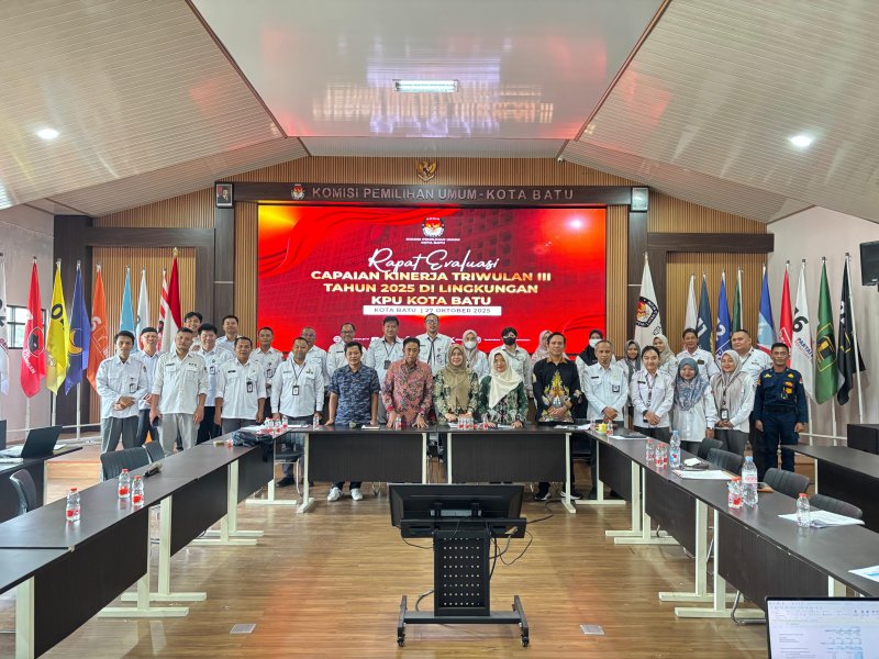 Batu, kota-batu.kpu.go.id - KPU Kota Batu menyelenggarakan Rapat Evaluasi Capaian Kinerja Triwulan III Tahun 2025 di Lingkungan KPU Kota Batu, Senin (27/10/2025). Ketua dan anggota KPU Kota Batu, serta sekretaris dan jajaran sekretariat hadir dalam evaluasi rutin tiga bulanan ini.