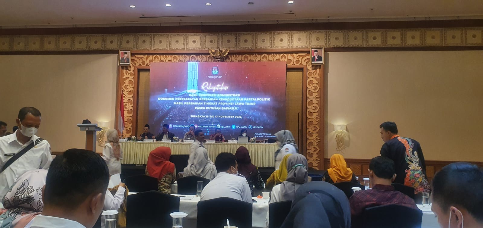 Surabaya, kota-batu.kpu.go.id- tiga orang dari KPU Kota Batu yaitu Divisi Teknis Penyelenggaraan, Erfanudin, Kasubbag Tekmas, Ariansyah Mustafa dan operator Sipol Nuning Sri Wahyuni, mengikuti kegiatan Rapat Koordinasi (Rakor) Penataan Daerah Pemilihan (Dapil) dan Alokasi Kursi Anggota Dewan Perwakilan Rakyat Daerah (DPRD) Kabupaten/Kota se-Jawa Timur hari ini Sabtu, 19 November 2022, mulai dari pukul 10.00 WIB-selesai, di aula lantai 2 kantor KPU Jatim, jalan Raya Tenggilis Nomor 1-3 Surabaya. Kegiatan ini dilaksanakan bertujuan untuk berkoordinasi dan menyamakan persepsi terkait rencana rancangan penataan dapil dan alokasi kursi anggota DPRD Kabupaten/Kota. Dalam sambutannya Ketua KPU Provinsi Jatim, Choirul Anam menghimbau agar seluruh peserta khususnya divisi Teknis penyelenggaraan agar memahami secsra utuh regulasi terkait tahapan dapil dan alokasi kursi, "Jangan pahami setengah-setengah, sepenggal-sepenggal. Pahami secara utuh seperti sebuah siklus," tegasnya. Dalam paparannya, Divisi teknis Penyelenggaraan, Insan Qoriawan, mengungkapkan penataan dapil dilakukan karena adanya perubahan jumlah penduduk yang mengakibatkan alokasi kursi dalam satu daerah pemilihan melebihi batas maksimal dan/atau kurang dari batas minimal yang ditentukan oleh Undang-undang. Lalu ada pemekaran wilayah atau bencana alam. Ketiga, adanya daerah pemilihan pada pemilu sebelumnya yang bertentangan dengan prinsip-prinsip penataan dapil. Sehingga oerlu kesepahaman bersama untuk menyusun rencana rancangan penataan dapil untuk Pemilu Tahun 2024. Dalam kegiatan rakor ini tiap KPU kabupaten/kota se-Jatim diberikan kesempatan memaparkan rencana rancangannya dengan memberikan penjelasan-penjelasan berdasarkan tujuh prinsip penyusunan dapil yakni kesetaraan nilai suara, ketaatan pada sistem pemilu yang proporsional, proporsionalitas, integralitas wilayah, berada dalam cakupan wilayah yang sama, kohesivitas, dan kesinambungan. Hal ini mengacu pada Peraturan KPU No. 6 Tahun 2022.