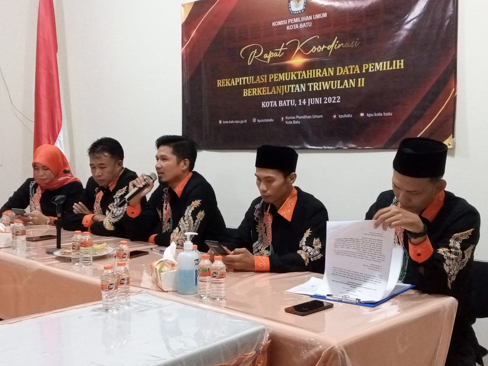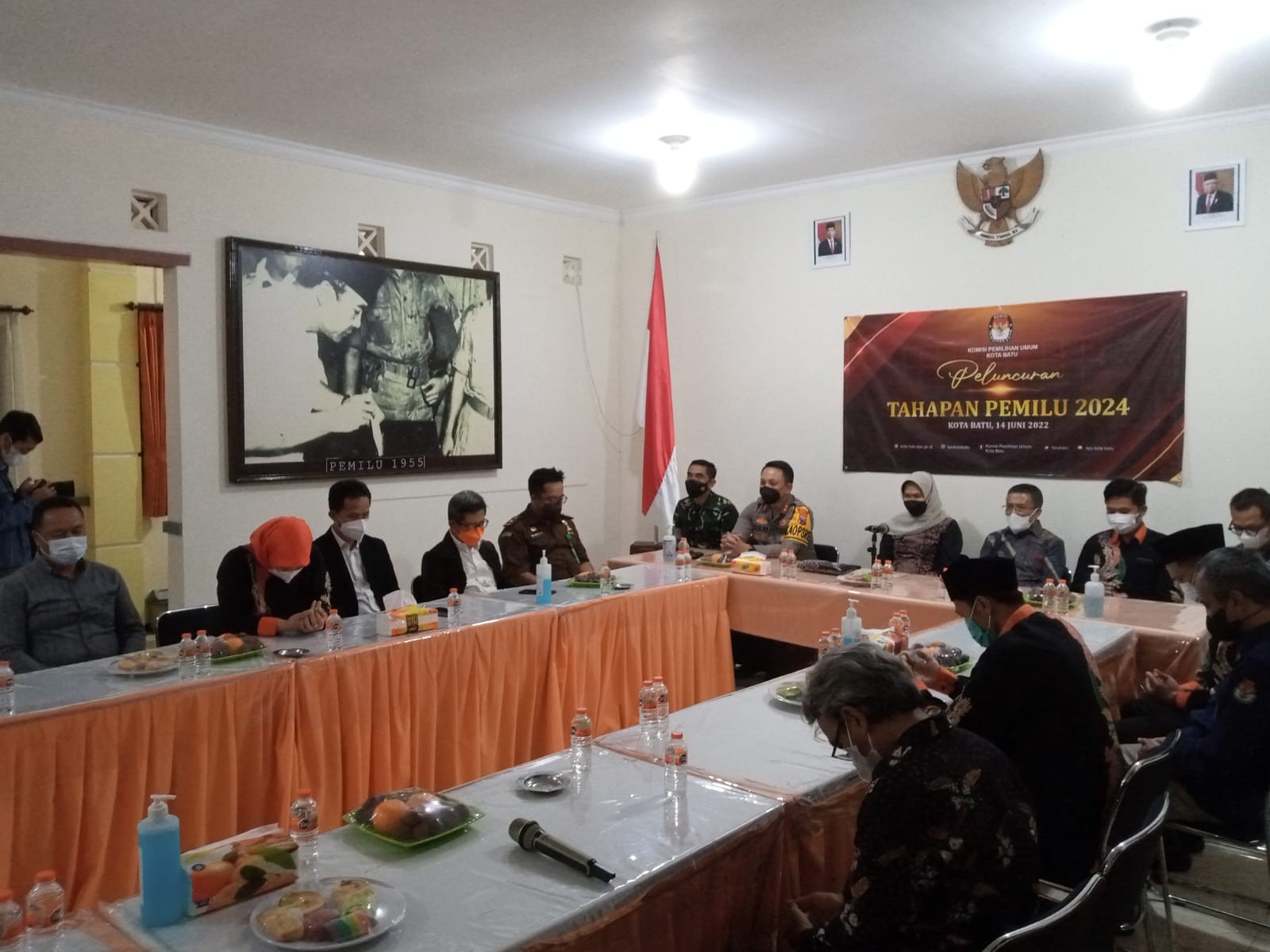 Batu, kota-batu.kpu.go.id ((15 Juni 2022) - Wali Kota Batu, Dewanti Rumpoko, Wakil Wali kota, Punjul Santoso, Wakil Ketua DPRD Kota Batu, Nurrohman, dan Kapolres Batu, AKBP I Nyoman Yogi Hermawan dan sejumlah pejabat di Lingkungan Pemerintah Kota Batu menghadiri secara langsung acara Peluncuran Tahapan Pemilu serentak Tahun 2024 di aula Kantor KPU Kota Batu, kemarin (14/6). Sedangkan pengurus partai politik di Kota Batu mengikuti acara tersebut secara daring. Acara ini berformat nonton bareng, dimana KPU Republik Indonesia menggelar seremoni peluncuran tahapan Pemilu 2024 di Kantor KPU RI, Jalan Imam Bonjol, Menteng, Jakarta Pusat. KPU Provinsi serta KPU Kabupaten/Kota menyaksikan secara live streaming bersama sejumlah pejabat forkompinda di daerah masing-masing. Dalam sambutannya, Mardiono mengatakan bahwa KPU Kota Batu mengapresiasi kehadiran Wali Kota dan Wakil Wali kota serta pada pejabat forkompinda yang berarti KPU Kota Batu mendapatkan dukungan penuh dari pemerintah Kota Batu. Tak lupa, Mardiono menyebut kehadiran Kapolres dan Pejabat Dandim 0818 sebagai tanda dukungan TNI dan Polri dalam memberikan kenyamanan bagi KPU Kota Batu agar dapat menyelenggarakan tahapan pemilu dengan lancar. “(karena) Keamanannya, ketertibannya dijaga oleh Kepolisian dan TNI,” ucapnya. Kehadiran Wakil Ketua DPRD, Nurrohman yang mewakili DPRD Kota Batu memberikan dukungan penuh bagi penyelenggara pemilu untuk menyukseskan tahapan pemilu 2024. Begitupun kehadiran pejabat dari Kajari yang turut hadir memberikan dukungan untuk kesuksesan penyelenggaraan tahapan pemilu secara nyata. Mardiono mengatakan KPU Kota Batu akan selalu bersinergi dengan Forkompinda. Mardiono mengatakan secara umum tugas untuk mensukseskan pemilu adalah tugas kita bersama. “Jadi semua elemen-elemen masyarakat, pejabat dan semua tokoh publik mempunyai kewajiban untuk mensukseskan pemilu,” tukasnya. Pada acara tersebut, Mardiono, kembali mengungkapkan keinginan KPU Kota Batu untuk memiliki gudang logistik yang memadai karena setelah pindah dari kantor lama yaitu di jalan raya Tlekung, KPU Kota Batu belum memiliki gudang yang layak. Di hadapan para undangan, Mardiono mengucapkan permintaan maaf kepada Wali Kota dan Kapolres apabila sedikit terganggu dengan pesan elektronik yang dikirim terkait permasalahan gudang. “Mohon maaf karena diakhir-akhir ini agak terganggu dengan japri saya terkait dengan gudang. Karena setelah pindah dari (jalan) Raya Tlekung, KPU Kota Batu belum punya gudang yang memadai. Oleh karenanya mohon ijin Pak Kapolres kenapa kami menginginkan safehouse reskim Polres Batu untuk gudang, karena kemudahan penjagaan karena dekat (dengan kantor KPU), ” tuturnya. Alasan diberikan karena area safehouse mudah diakses dari Kantor KPU juga karena SDM di KPU Kota Batu sangat terbatas untuk penjagaan bila lokasi gudang jauh dari kantor. “KPU Kota Batu juga berkomunikasi untuk gedung pengganti bagi teman-teman reskim,” ungkapnya.(nng)