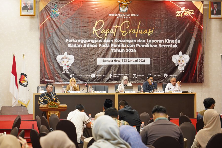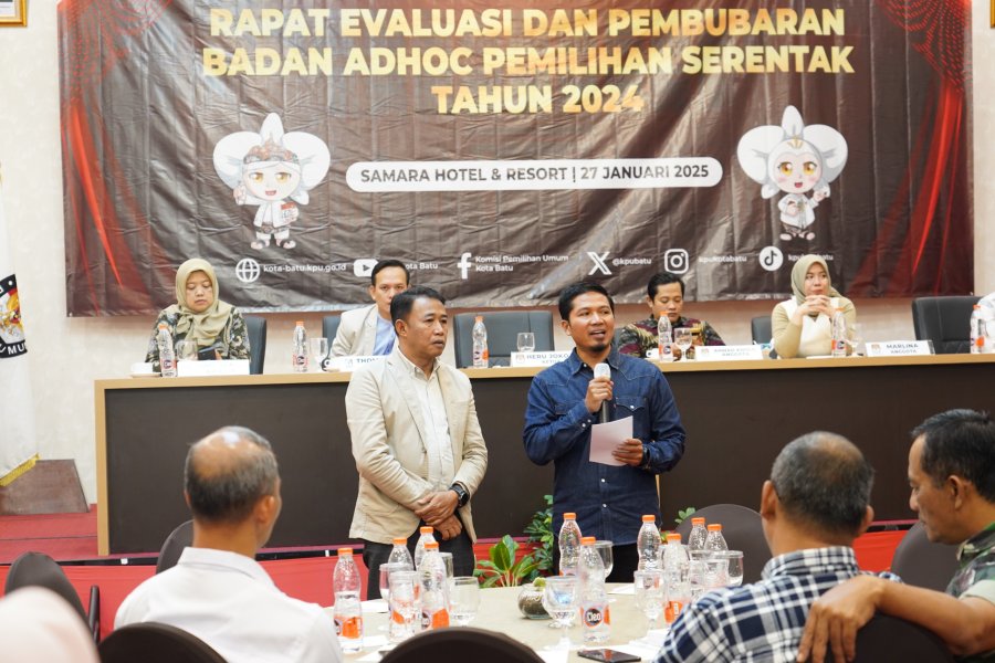 Batu, kota-batu.kpu.go.id - KPU Kota Batu menyelenggarakan Rapat Evaluasi dan Pembubaran Badan Adhoc Pemilihan Serentak Tahun 2024, Senin (27/1/2025) di Samara Hotel. Seluruh anggota badan adhoc yang meliputi PPK, PPS, dan jajaran sekretariat hadir dalam kegiatan yang merupakan masa akhir pelaksanaan tugas mereka.