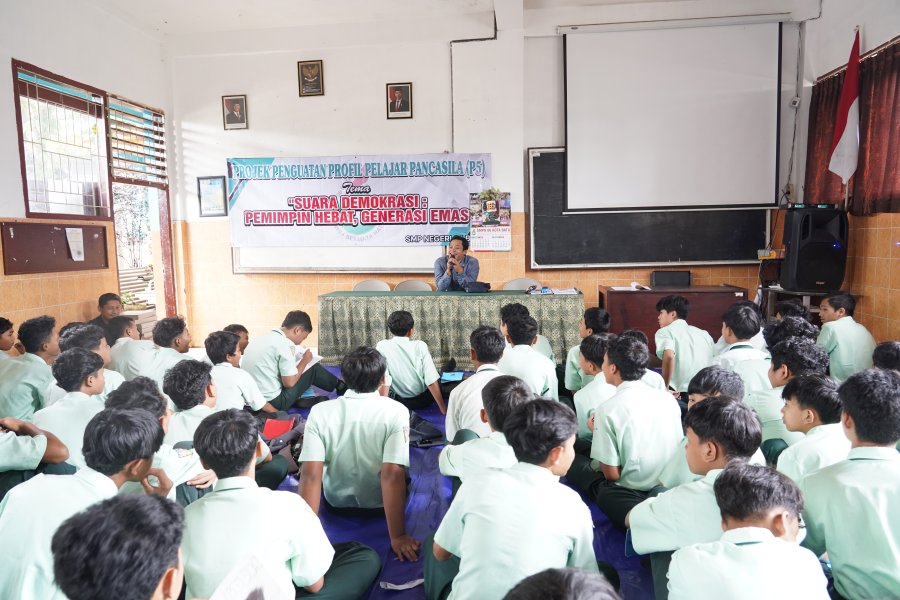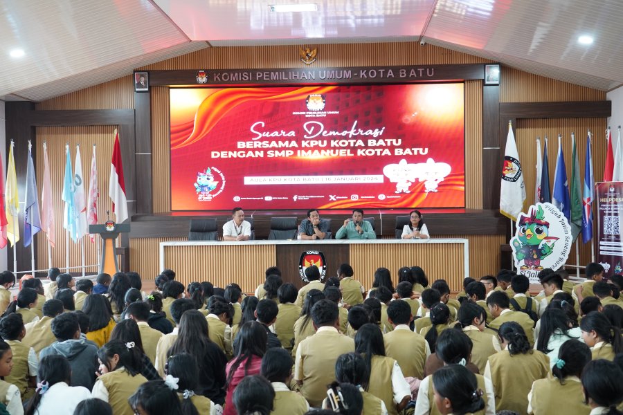 Batu, kota-batu.kpu.go.id - Anggota KPU Kota Batu Divisi Sosdiklih, Parmas, dan SDM, Ahmad Kholil Almansur hadir memberikan materi dalam kegiatan Projek Penguatan Profil Pelajar Pancasila (P5) SMP Immanuel Kota Batu, Kamis (16/1/2025). Ratusan siswa tampak antusias mengikuti sharing kepemiluan, demokrasi, dan tugas KPU sebagai penyelenggara. Dalam kegiatan yang dilaksanakan di Aula Kantor KPU Kota Batu tersebut, Kholil menuturkan pentingnya pemahaman yang baik mengenai politik dan demokrasi, khususnya bagi pelajar sebagai generasi penerus bangsa. Ia memberikan penjelasan mengenai politik, termasuk contoh praktek politik dalam kehidupan sehari-hari. "Misalnya, teman-teman meminta tambahan uang saku sekolah atau meminta sesuatu kepada orang tua, itu merupakan contoh kecil politik dalam keseharian kita," ungkapnya. Melalui kegiatan ini, diharapkan para siswa dapat memahami peran penting mereka dalam demokrasi serta mempersiapkan diri untuk ikut berpartisipasi secara aktif dalam penyelenggaraan pemilu mendatang, termasuk menjadi calon pemimpin bagi masyarakat dan bangsa. Dalam kesempatan tersebut, para siswa juga berkesempatan melakukan tanya jawab dan diskusi secara interaktif. Berbagai pertanyaan menarik pun mereka sampaikan.
