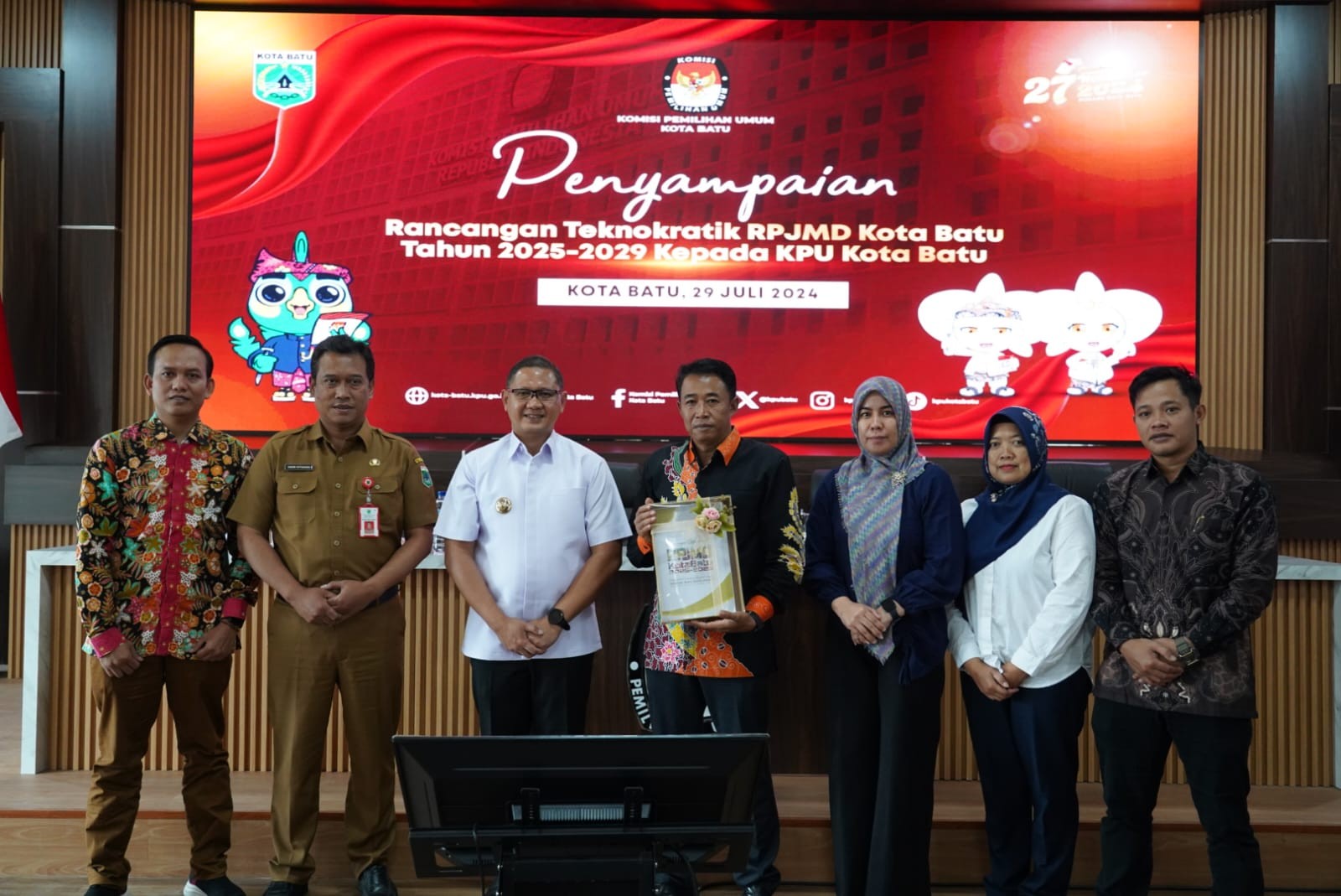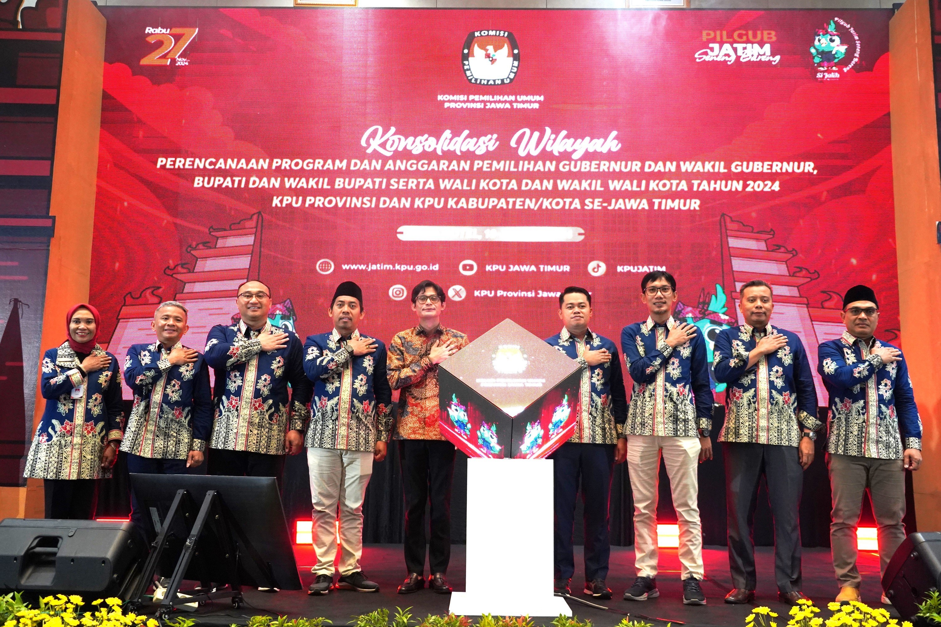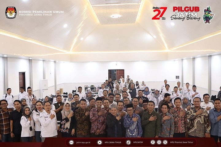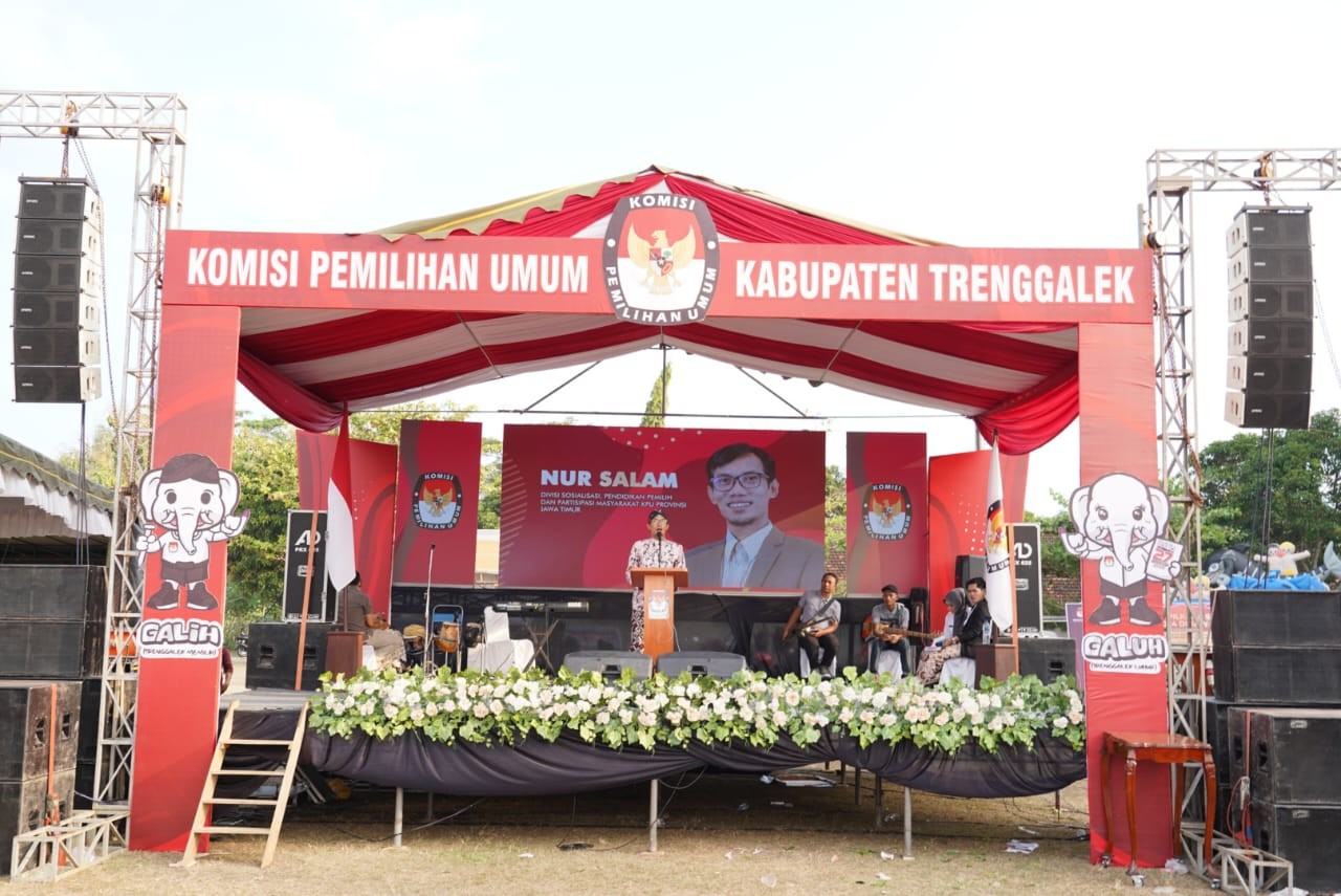 Trenggalek, kota-batu.kpu.go.id - (1 Agustus 2024) - KPU Kota Batu menghadiri undangan Serah Terima Kirab Maskot Pilkada Serentak Tahun 2024 di Kabupaten Trenggalek dari Kabupaten Ponorogo, Kamis (1/8/2024). Kegiatan serah terima dilaksanakan di Lapangan Desa Nglongsor, Kecamatan Tugu, Kabupaten Trenggalek, mulai pukul 09.00 hingga 16.40 Wib. Acara dibuka dengan menyanyikan lagu Indonesia Raya, jingle Pilgub Jawa Timur dan jingle Pilkada Kabupaten Trenggalek. Sambutan-sambutan diberikan oleh perwakilan Pemerintah Kabupaten Trenggalek dan Anggota KPU Provinsi Jawa Timur Divisi Sosialisasi Pendidikan Pemilih dan Partisipasi Masyarakat, Nur Salam. Salam mengatakan bahwa Pilkada Serentak 2024 merupakan agenda besar bangsa Indonesia menyongsong pergantian kepemimpinan, baik gubernur, bupati, maupun wali kota beserta wakilnya. Ia mengajak agar seluruh elemen masyarakat turut serta menyukseskan penyelenggaraan momentum demokrasi ini. Hal mendasar dan sederhana, katanya, dengan menyebarluaskan tanggal pemungutan suara pada 27 November 2024 nanti. Menurutnya, hal yang tak kalah penting ialah bahwa seluruh pihak memiliki kewajiban menciptakan suasana tertib, aman, nyaman, dan gembira dalam pelaksanaan seluruh tahapan Pilkada 2024. Hal ini sesuai semangat yang dibawa pada tagline “Pilgub Jatim Seneng Bareng”. Puncak acara serah terima ditandai dengan penandatanganan bersama Pakta Integritas Pilkada Serentak Tahun 2024 oleh KPU, Bawaslu, dan Forkopimda Kabupaten Trenggalek serta partai politik, dilanjutkan dengan kirab Maskot Si Jalih dan Galih-Galuh di beberapa wilayah Kabupaten Trenggalek. (Ats)