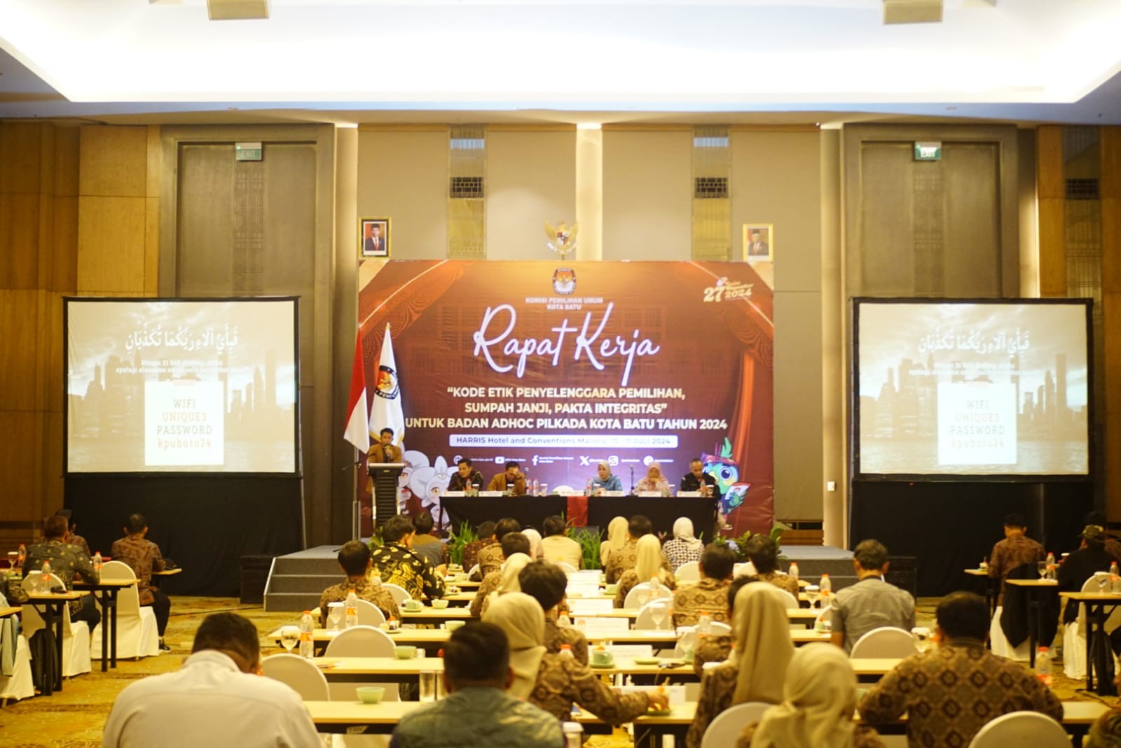 Malang, kota-batu.kpu.go.id - (10 Juli 2024) - KPU Kota Batu menyelenggarakan Rapat Kerja (Raker) Kode Etik Penyelenggara Pemilihan, Sumpah Janji, dan Pakta Integritas untuk Badan Adhoc Pilkada Kota Batu Tahun 2024, Rabu-Kamis (10-11/7/2024) di Harris Hotel and Conventions Malang. Peserta raker ialah ketua, anggota, sekretaris PPK dan PPS se-Kota Batu.