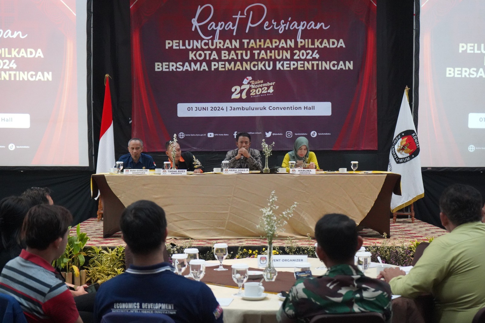 Batu, kota-batu.kpu.go.id - (1 Juni 2024) - Ketua KPU Kota Batu, Heru Joko Purwanto memimpin pelaksanaan Upacara Peringatan Hari Lahir Pancasila Tahun 2024 di lingkungan Sekretariat KPU Kota Batu, Sabtu (1/6/2024). Dalam peringatan bertema "Pancasila Jiwa Pemersatu Bangsa Menuju Indonesia Emas 2045" tersebut ia membacakan pesan penting yang tertuang dalam Sambutan Badan Pembinaan Ideologi Pancasila (BPIP). Pertama, tema Pancasila Jiwa Pemersatu Bangsa menunjukkan bahwa bangsa Indonesia yang memiliki keragaman suku, agama, budaya, dan bahasa mampu terus bersatu dan menjaga persatuan. Hal ini ialah modal berharga menuju momentum 100 Tahun Indonesia Emas pada 2045 nanti. Kedua, laksana bintang, Pancasila ialah sinar terang yang memandu kehidupan bangsa Indonesia agar sesuai dengan cita-cita pendirian negara. Di dalamnya terkandung nilai-nilai inklusivitas, toleransi, dan gotong royong. Ketiga, agar relevan dengan kehidupan sehari-hari maka nilai-nilai Pancasila harus diimplementasikan dalam kehidupan bermasyarakat, berbangsa, dan bernegara. Pancasila harus menjadi pedoman utama dalam membangun kemajuan negara Indonesia. (Ats)