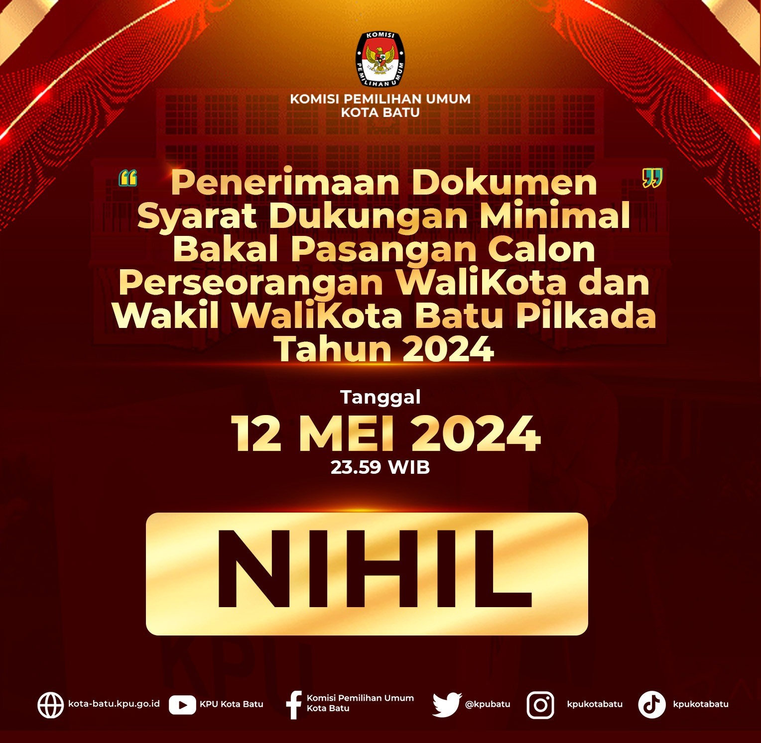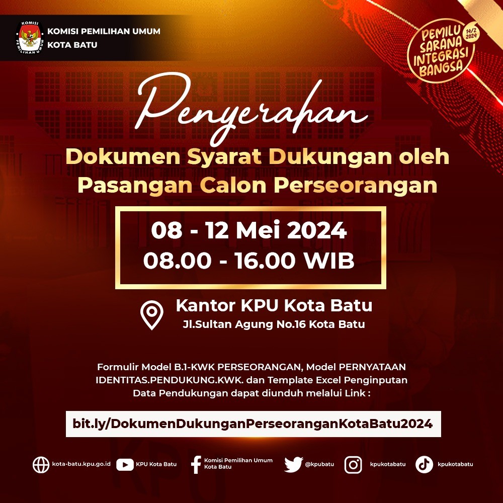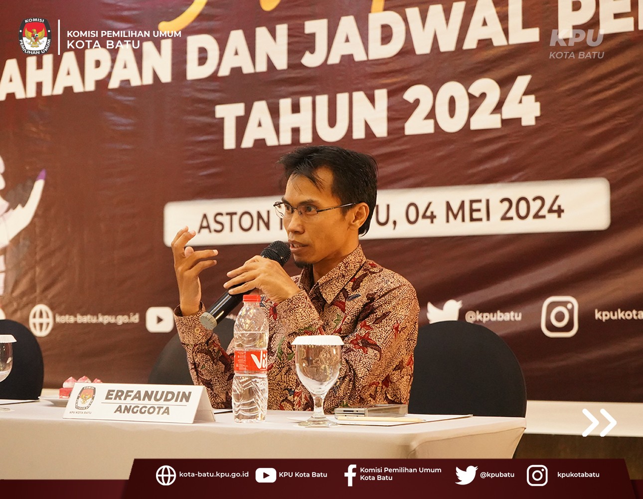 Sementara Anggota KPU Divisi Teknis Penyelenggaraan, Erfanudin mengatakan bahwa proses pencalonan perseorangan Wali Kota dan Wakil Wali Kota Batu Tahun 2024 akan segera dimulai. Menurutnya, dukungan untuk calon perseorangan minimal 10 persen dari total DPT dan tersebar pada dua kecamatan.