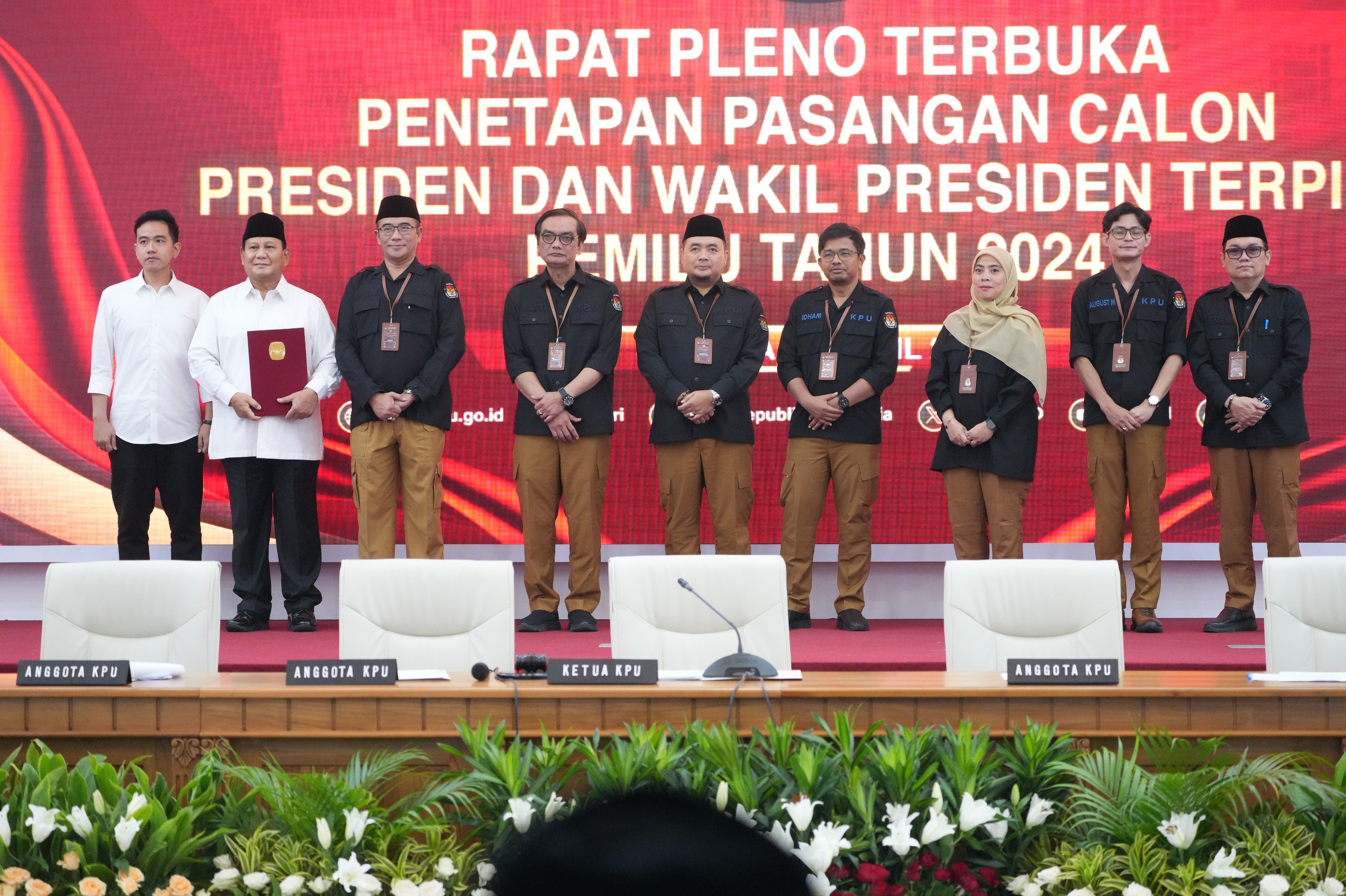 Jakarta, kota-batu.kpu.go.id - Komisi Pemilihan Umum (KPU) menggelar Rapat Pleno Terbuka Penetapan Pasangan Calon Presiden dan Wakil Presiden Terpilih Pemilu Tahun 2024 di Ruang Sidang Lantai 2, Rabu, (24/4/2024). Memimpin rapat pleno terbuka Ketua KPU Hasyim Asy'ari, Anggota KPU Idham Holik, August Mellaz, Betty Epsilon Idroos, Yulianto Sudrajat, Mochammad Afifuddin, Parsadaan Harahap, bersama Sekretaris Jenderal KPU Bernad Dermawan Sutrisno. Rapat pleno ini menetapkan Pasangan Calon Presiden dan Wakil Presiden Nomor Urut 2, H. Prabowo Subianto dan Gibran Rakabuming Raka sebagai Calon Presiden dan Calon Wakil Presiden Terpilih Pemilu Tahun 2024 Periode 2024-2029. Selanjutnya berlangsung penyerahan Berita Acara kepada MPR, DPR, Perwakilan Presiden, Mendagri, Partai Politik Peserta Pemilu, dan Calon Presiden dan Wakil Presiden Terpilih Turut hadir Pasangan Calon Presiden dan Calon Wakil Presiden Nomor Urut 1, Pimpinan Partai Politik Peserta Pemilu Tahun 2024, Ketua MPR RI, Pimpinan DPR RI, Menkopolhukam, Mendagri, TNI, BIN, Polri, Kejagung, Kemenlu, Ketua dan Anggota DKPP, Anggota Bawaslu RI, serta jajaran Pejabat Eselon I dan II Setjen KPU.