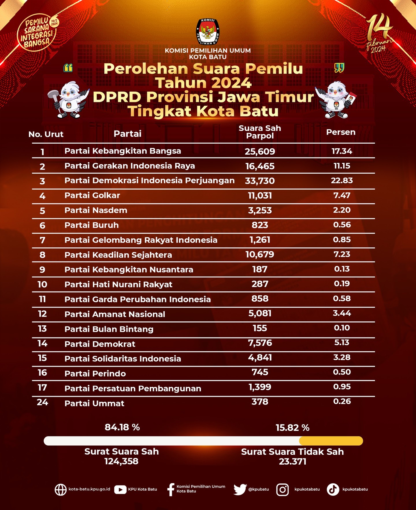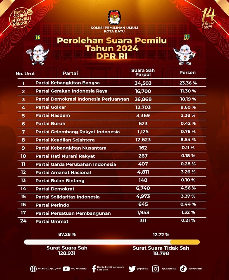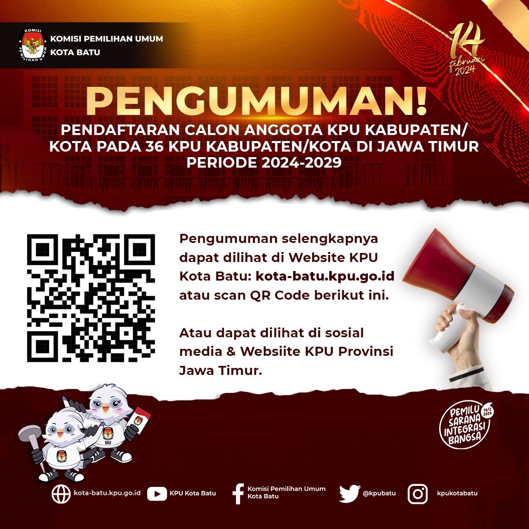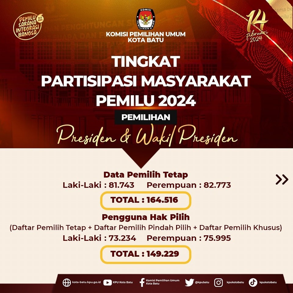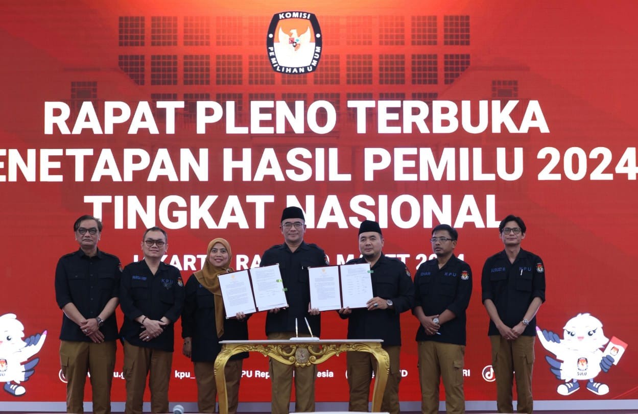 Jakarta, kota-batu.kpu.go.id - (20 Maret 2024) - KPU menggelar Rapat Pleno Terbuka Penetapan Hasil Pemilu 2024 Tingkat Nasional, Rabu (20/3/2024) di Kantor KPU. Rapat pleno terbuka ini dipimpin oleh Ketua KPU Hasyim Asy'ari, Idham Holik, Mochammad Afifuddin, August Mellaz, Betty Epsilon Idroos, Yulianto Sudrajat, dan Parsadaan Harahap bersama Sekretaris Jenderal KPU Bernad Dermawan Sutrisno, di Ruang Sidang Utama Lantai 2 KPU. Pada kesempatan itu, Hasyim memimpin tiga rangkaian acara, yaitu pertama, pembacaan dan penandatanganan Berita Acara Penetapan Rekapitulasi Hasil Perolehan Suara Tingkat Nasional, yaitu Pemilu Presiden dan Wakil Presiden, DPR RI dan DPD RI. Kedua, pembacaan dan penandatanganan Berita Acara Penetapan Hasil Pemilu Secara Nasional, yaitu Pemilu Presiden dan Wakil Presiden, DPR RI, DPD RI, DPRD Provinsi dan DPRD Kabupaten/Kota. Ketiga, Pembacaan dan Penandatanganan Keputusan KPU Penetapan Hasil Pemilu Secara Nasional. Turut hadir Ketua Komisi II DPR RI, Menkopolhukam, Mendagri, Kepala BIN, Perwakilan Kemenlu, TNI, Polri, Bawaslu, para saksi dari perwakilan partai politik dan pasangan calon presiden dan wakil presiden peserta Pemilu 2024, jajaran Sekretariat Jenderal KPU, serta diliput media massa dan disiarkan secara langsung di kanal Youtube KPU RI untuk bisa diakses masyarakat luas. Keputusan Komisi Pemilihan Umum Nomor 360 Tahun 2024 tentang Penetapan Hasil Pemilihan Umum Presiden dan Wakil Presiden, Anggota Dewan Perwakilan Rakyat, Dewan Perwakilan Daerah, Dewan Perwakilan Rakyat Daerah Provinsi, dan Dewan Perwakilan Rakyat Daerah Kabupaten/Kota secara Nasional Dalam Pemilihan Umum Tahun 2024, selengkapnya KLIK DI SINI Sumber: kpu.go.id