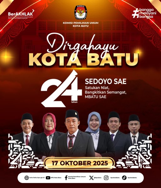 Batu, kota-batu.kpu.go.id - Dua puluh empat tahun perjalanan Kota Batu bukan sekadar rentang waktu, melainkan kisah tentang kerja keras, sinergi, dan cinta terhadap tanah kelahiran. Dari hamparan kebun apel hingga gemerlap wisata modern, Batu tumbuh menjadi kota yang sejuk secara alam, damai secara sosial, dan dinamis dalam pembangunan.