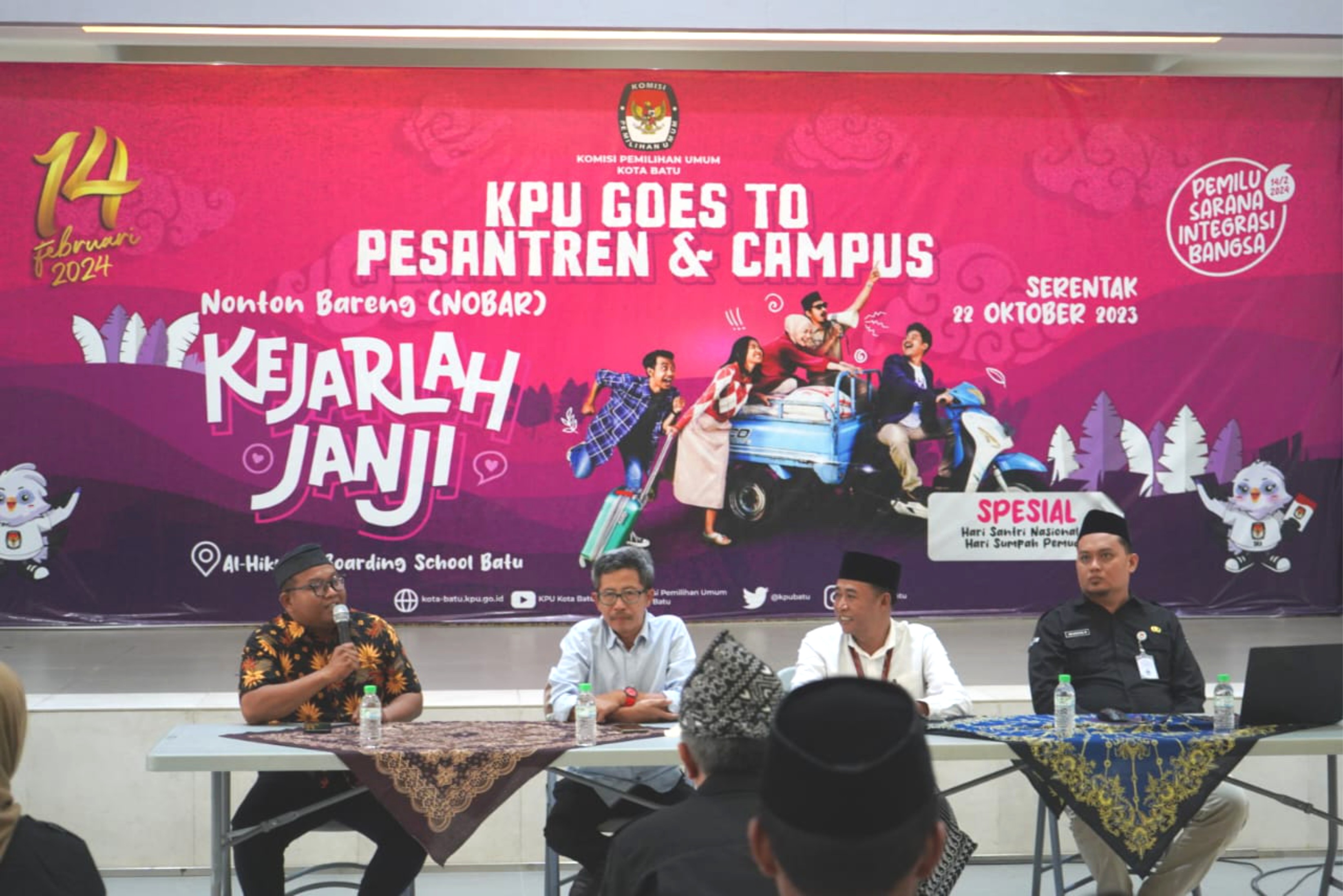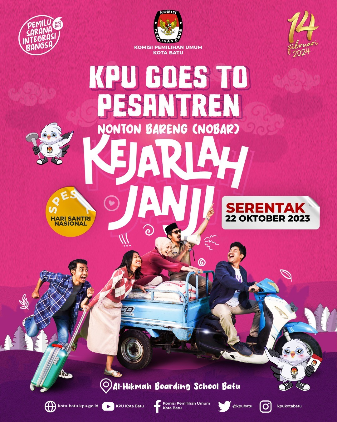 Batu, kota-batu.kpu.go.id - (22 Oktober 2023) - Momentum peringatan Hari Santri Nasional 2023 disambut dengan antusias oleh KPU. Tepat pada hari ini, Minggu 22 Oktober 2023 KPU mengadakan nonton bareng (nobar) Film Kejarlah Janji @filmkejarlahjanji secara serentak di seluruh Indonesia bertajuk "KPU Goes to Pesantren". Di Kota Batu, pemutaran film besutan sutradara Garin Nugroho tersebut diselenggarakan oleh KPU Kota Batu di Al-Hikmah Boarding School. Ratusan siswa tingkat SMP dan SMA antusias ikut nobar. Ketua KPU Kota Batu, Heru Joko Purwanto dalam sambutan pembuka menyampaikan bahwa acara nobar film ini menjadi persembahan spesial KPU pada Hari Santri Nasional. Heru menerangkan bahwa dipilihnya pondok pesantren sebagai lokasi nobar film Kejarlah Janji sebab lembaga pendidikan ini ialah wadah mencetak calon pemimpin sekaligus tempat para pemilih pemula berkumpul. "Teman-teman di sini banyak yang masuk usia pemilih pemula, jangan lupa gunakan hak pilih kalian dengan baik. Saat ini memilih dan pasti suatu saat nanti teman-teman yang akan dipilih (menjadi pemimpin)," tegasnya. Film Kejarlah Janji menjadi media yang penting untuk membangun kesadaran kepada generasi muda tentang pemilu. Melalui film ini, KPU berharap masyarakat pemilih dapat menggunakan hak pilihnya dengan bijak, melawan praktek politik uang, menghindari politik identitas dan SARA, serta membangun sikap toleransi. “Film sangat kuat dalam menyampaikan pesan, hiburan, dan informasi kepada masyarakat secara luas, terutama untuk generasi milenial dan pemilih pemula Gen Z,” ungkap Ketua KPU RI, Hasyim Asy’ari ketika launching film (15/9/2023).