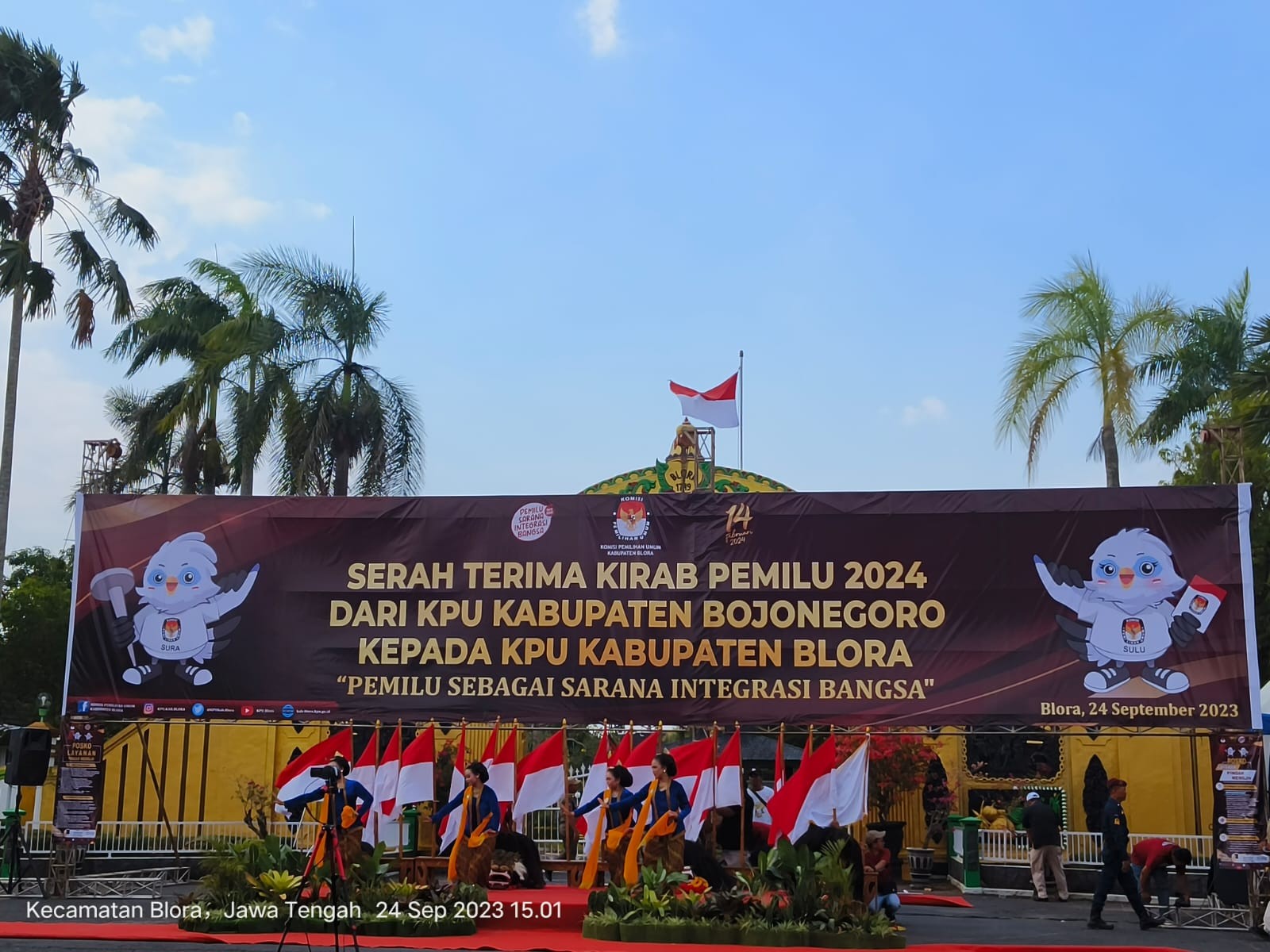 Prosesi pelepasan digelar di Kantor Kecamatan Padangan Bojonegoro yang menjadi wilayah perbatasan dengan Jateng. Seluruh jajaran Panitia Pemilihan Kecamatan (PPK) dan Panitia Pemungutan Suara (PPS) se-Bojonegoro menyambut rombongan kirab dengan peragaan flashmob Jingle Pemilu 2024.