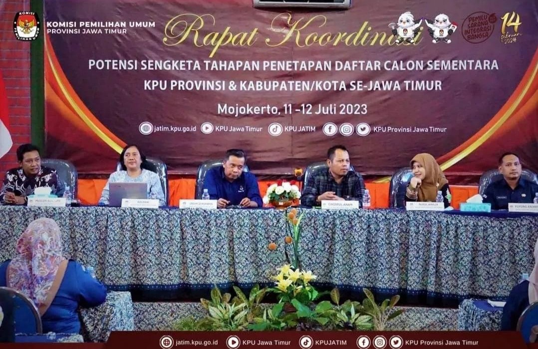 Mojokerto, kota-batu.kpu.go.id - (13 Juli 2023) - Ketua KPU Jawa Timur, Choirul Anam menyampaikan bahwa potensi sengketa dalam setiap tahapan pemilu bersumber pada dua hal, yakni faktor internal dan eksternal. Hal tersebut disampaikan Anam dalam Rapat Koordinasi Potensi Sengketa Tahapan Penetapan Daftar Calon Sementara (DCS) KPU kabupaten/kota se-Jawa Timur, Selasa-Rabu (11-12/7/2023) di Mojokerto.