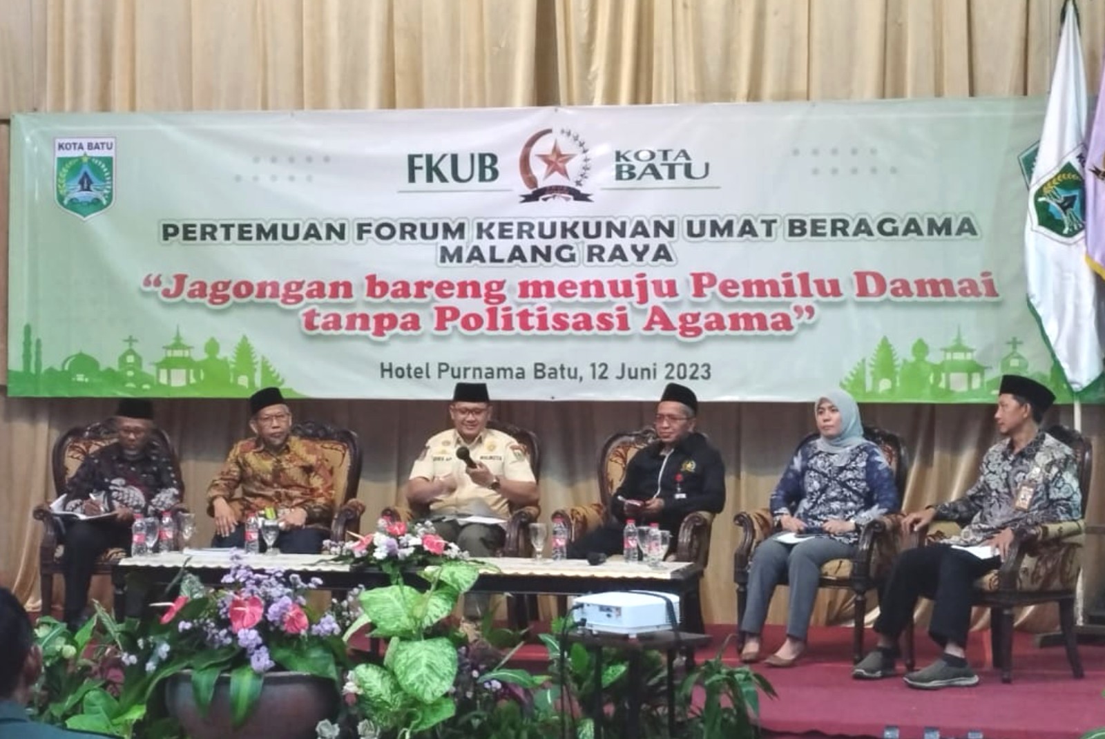 Batu, kota-batu.kpu.go.id - (14 Juni 2023) - Upaya mewujudkan pemilu aman dan damai terus dilakukan oleh berbagai pihak. Salah satunya, menjauhkan politisasi agama dan politik identitas dalam momentum pemilu. Hal tersebut menjadi bahasan utama dalam acara “Jagongan Bareng Menuju Pemilu Damai Tanpa Politisasi Agama” oleh Forum Kerukunan Umat Beragama (FKUB) Kota Batu, Senin (12/6/2023). Dalam diskusi yang dihadiri oleh berbagai stakeholder tersebut, dibahas bagaimana cara mewujudkan Pemilu 2024 agar bisa berjalan damai, terutama menghilangkan isu politisasi agama sebagaimana terjadi pada pemilu sebelumnya. Untuk kepentingan tersebut, Pj. Wali Kota Batu, Aries Agung Paewai menyebutkan pemuka agama yang memiliki legitimasi sosial dan spiritual memiliki peran penting. Sementara itu, Anggota KPU Kota Batu Divisi Sosdiklih, Parmas, dan SDM, Marlina menyebutkan jika politisasi agama digunakan oleh oknum-oknum tertentu untuk memperoleh suara dukungan atau memenangkan pemilu. Yang terjadi, lanjutnya, ialah penyebaran berita hoaks terhadap isu-isu sensitif tersebut. Oleh karena itu, Marlina menegaskan agar semua pihak berupaya mendorong dan mengedukasi masyarakat agar cerdas dalam pemilih sekaligus menghindari isu hoaks, maupun isu SARA lainnya. Kerja tersebut, kata Marlina, tidak hanya menjadi tanggung jawab KPU, melainkan seluruh stakeholder. “Tugas kami juga melakukan edukasi, melalui media sosial, atau ke sekolah-sekolah, pertemuan keormasan. Tujuannya untuk meningkatkan kesadaran pemilih. Memang tidak bisa instan, sehingga perlu dilakukan beberapa kali dan bantuan masyarakat,” tegasnya. Sejalan dengan maksud tersebut, Ketua Bawaslu Kota Batu, Abdur Rochman menyatakan bahwa peserta pemilu tidak boleh menggunakan tempat ibadah untuk kegiatan kampanye dan sejenisnya. Lembaganya juga selalu mendorong agar pemuka agama yang tergabung dalam FKUB untuk menjaga kemurnian tempat ibadah masing-masing. (Ats)