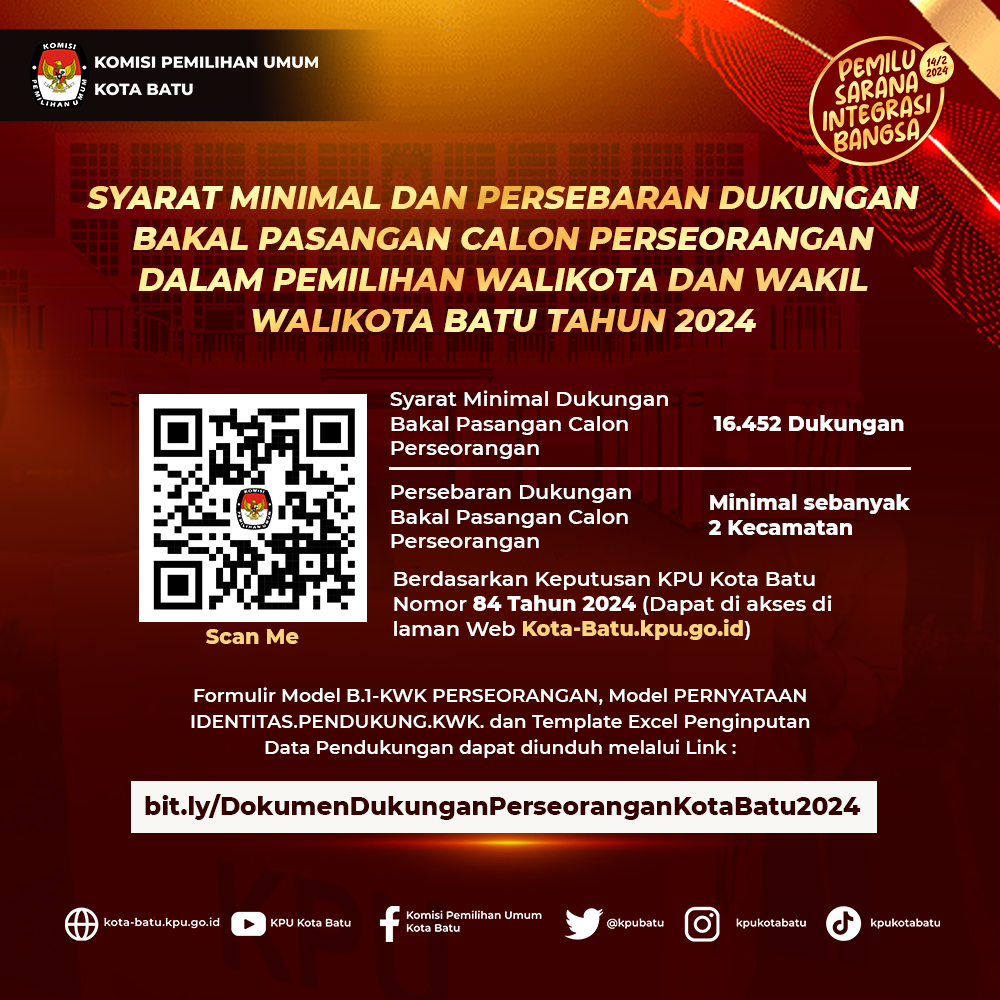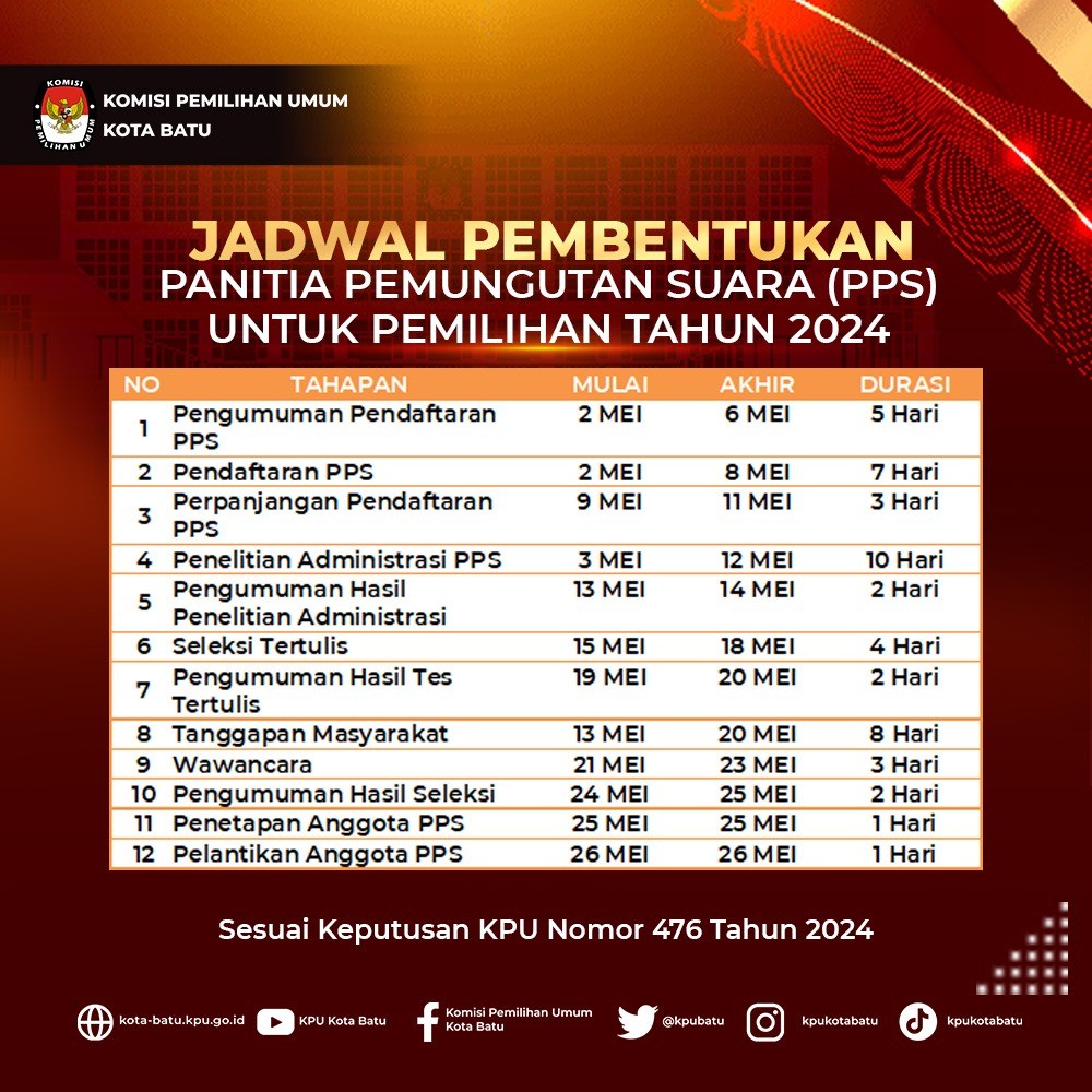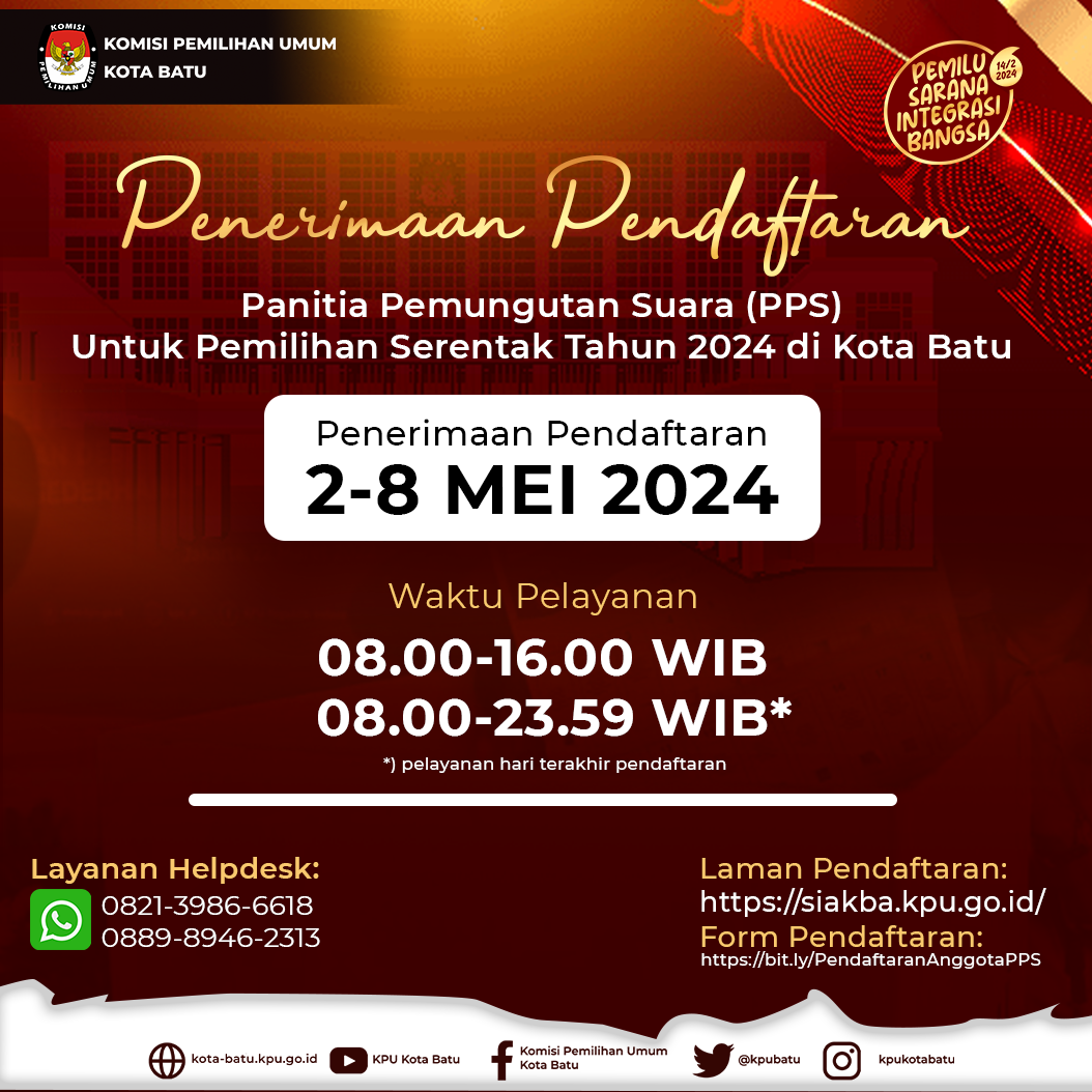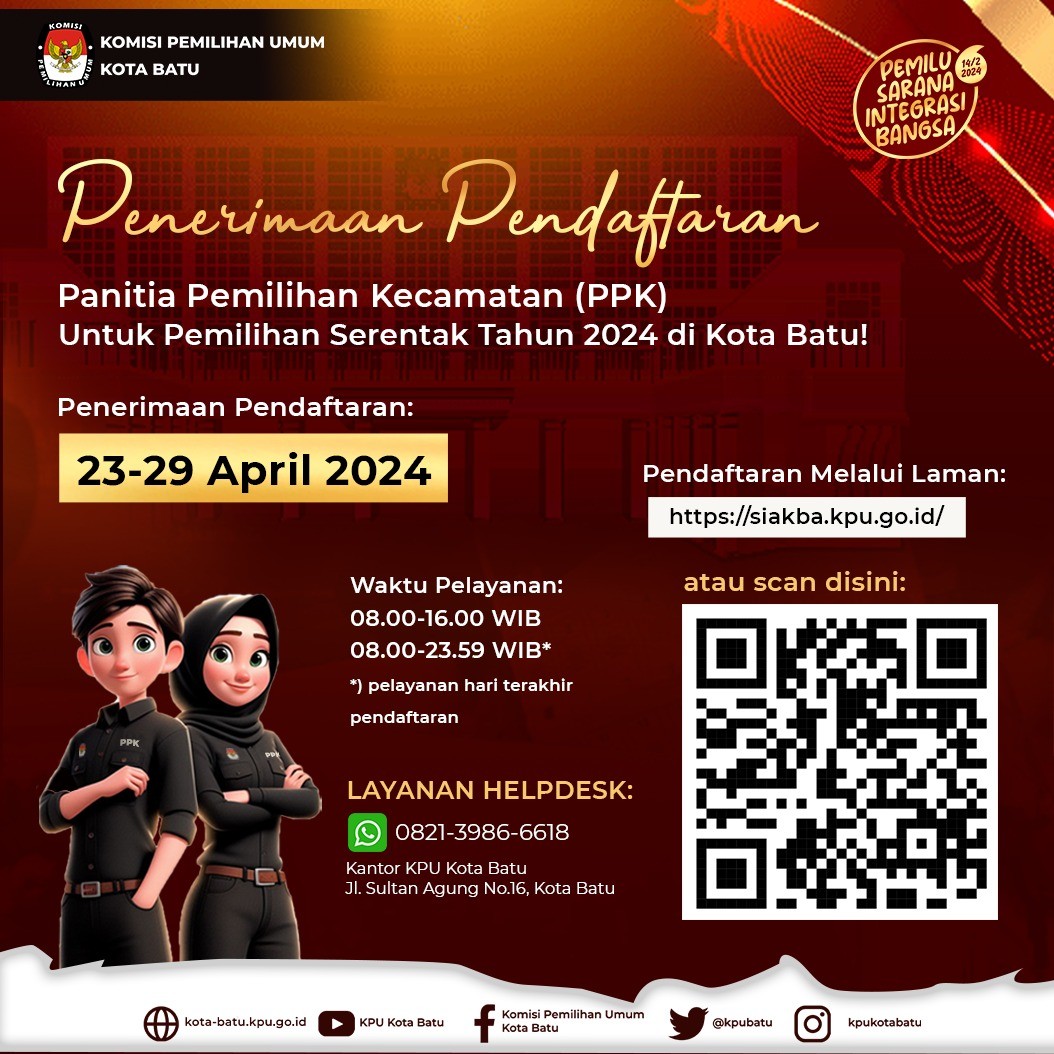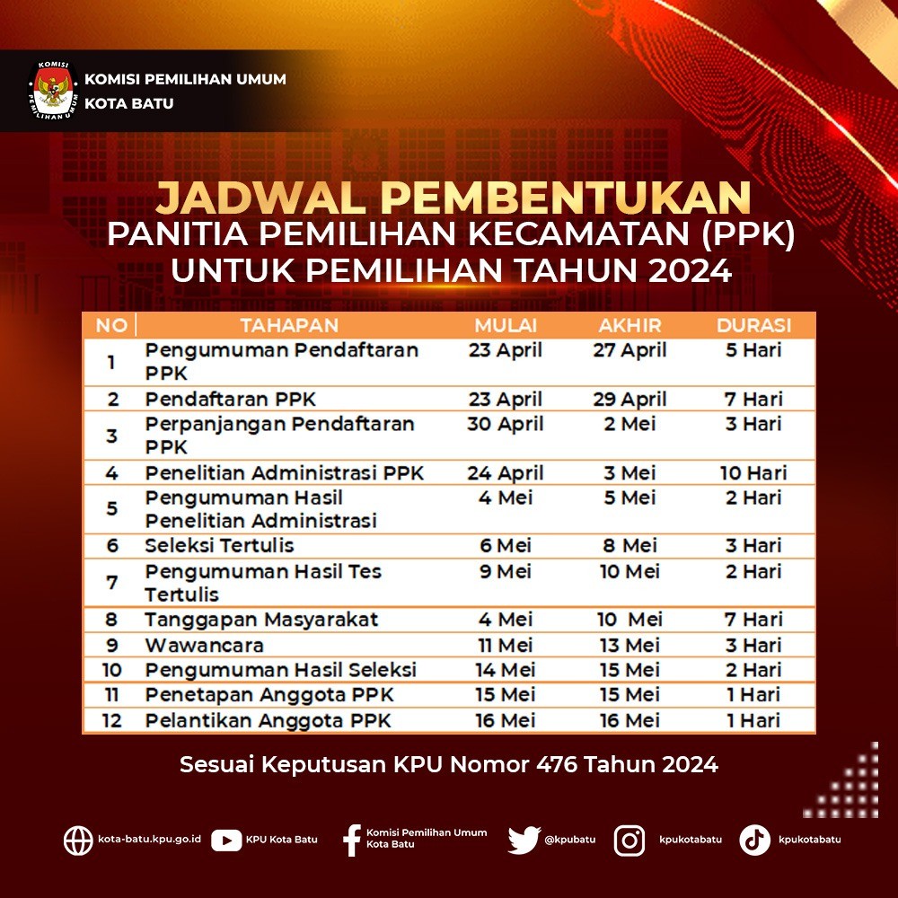 Batu, kota-batu.kpu.go.id - (23 April 2024) - KPU Kota Batu membuka pendaftaran calon anggota Panitia Pemilihan Kecamatan (PPK) untuk Pemilihan Serentak Tahun 2024. Detail pengumuman dan persyaratan pendaftaran dapat dilihat pada Pengumuman KPU Kota Batu Nomor 01/PP.04.2-Pu/3579/2024 tentang Seleksi Calon Anggota Pantia Pemilihan Kecamatan (PPK) untuk Pemilihan Gubernur dan Wakil Gubernur, Bupati dan Wakil Bupati, serta Wali Kota dan Wakil Wali Kota Tahun 2024 yang terlampir pada pengumuman ini.