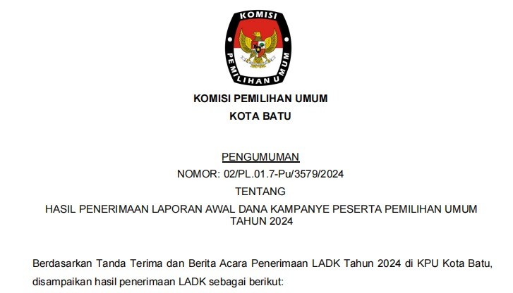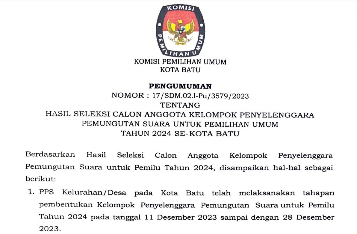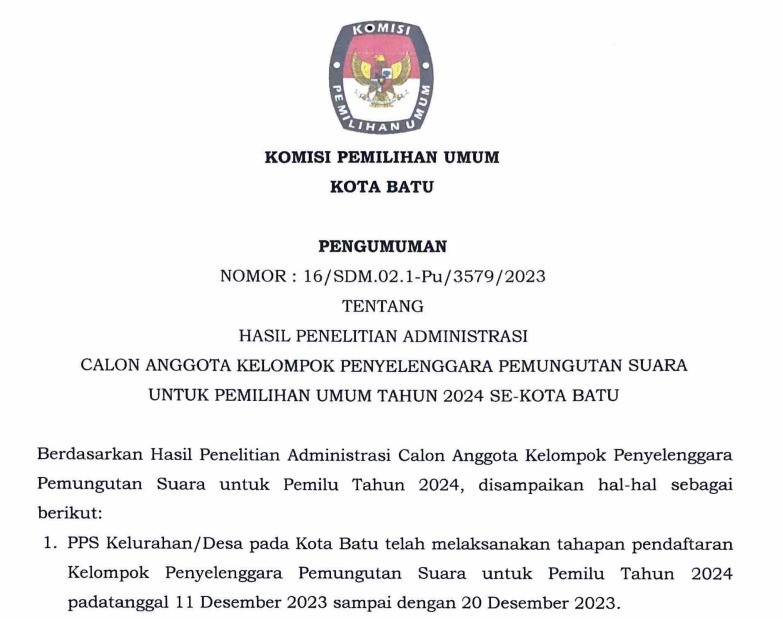 Batu, kota-batu.kpu.go.id - (11 Maret 2024) - Pendaftaran calon anggota Komisi Pemilihan Umum (KPU) Kota Batu periode 2024-2029 telah dibuka. Pendaftaran ini sesuai Keputusan KPU Nomor 318 Tahun 2024 tentang Jadwal Tahapan Seleksi Calon Anggota KPU Kabupaten/Kota pada 37 Kabupaten/Kota di 2 Provinsi Periode 2024-2029.
