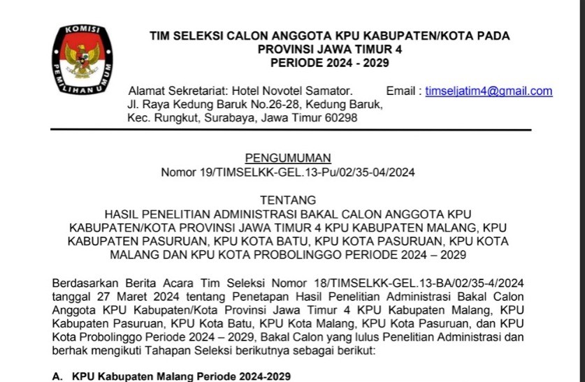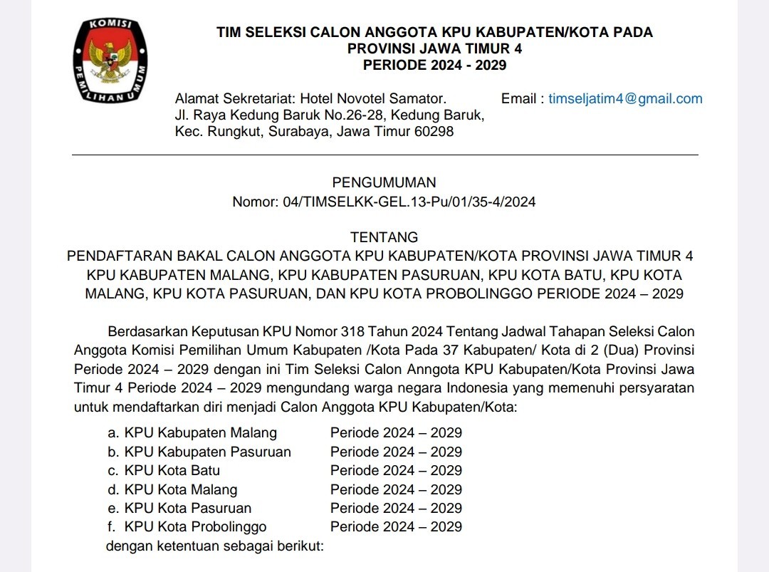 Pengumuman Pendaftaran Calon Anggota KPU Wilayah Jawa Timur 4: