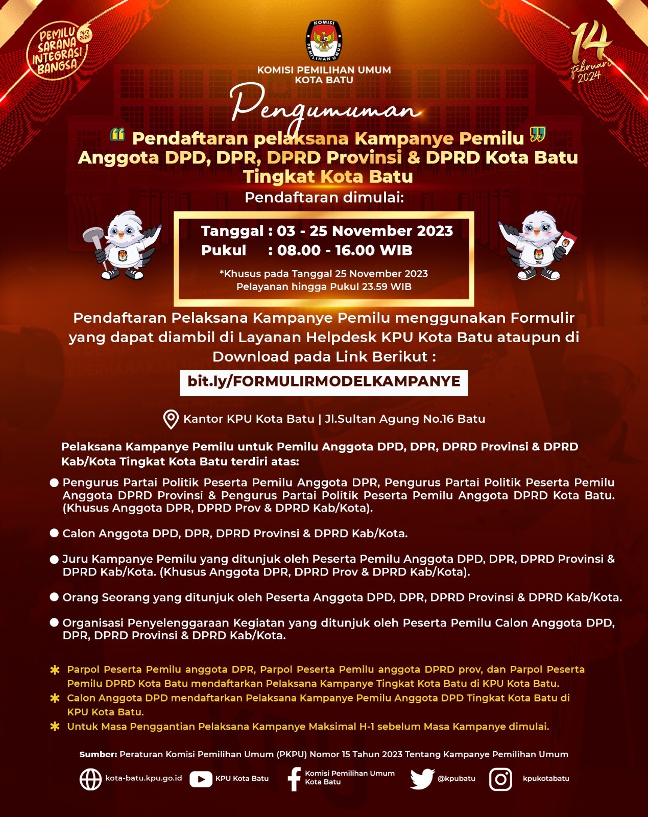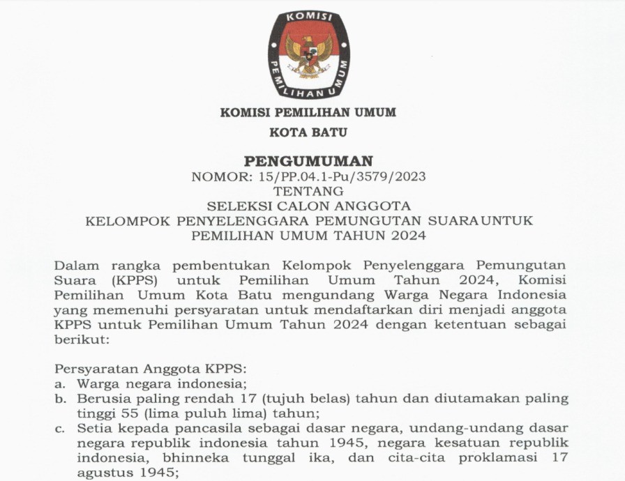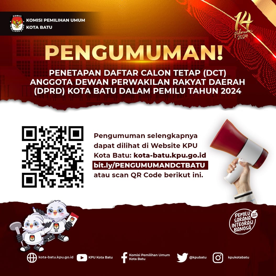 DCT Anggota DPRD Kota Batu pada Pemilu 2024 diumumkan mulai hari ini, 4 November 2023 melalui berbagai saluran media cetak, media elektronik, radio, dan media sosial.