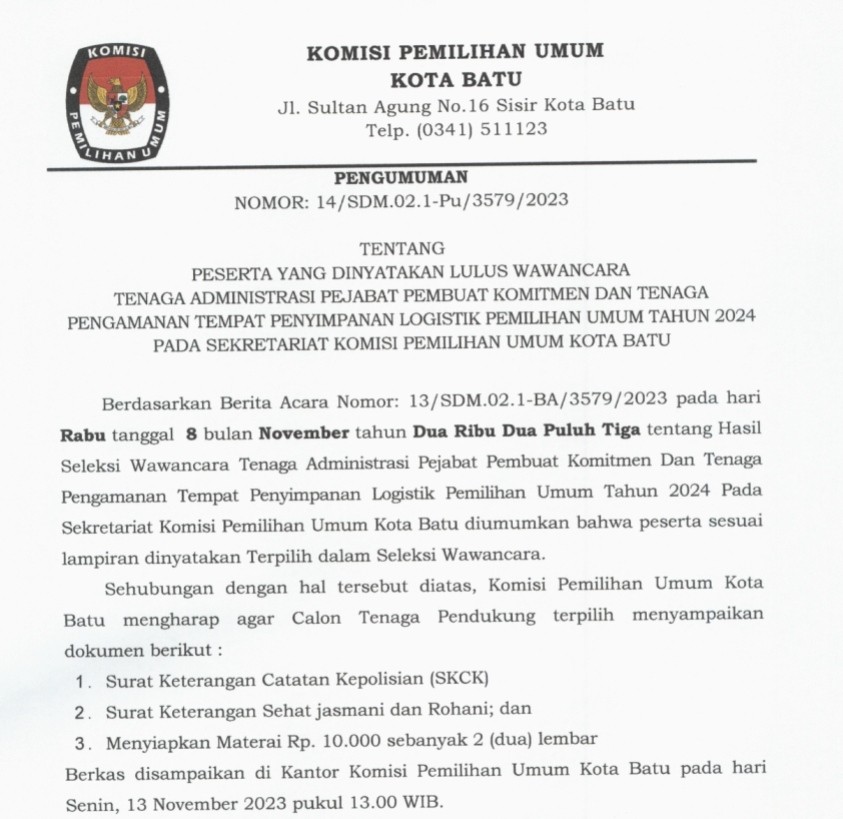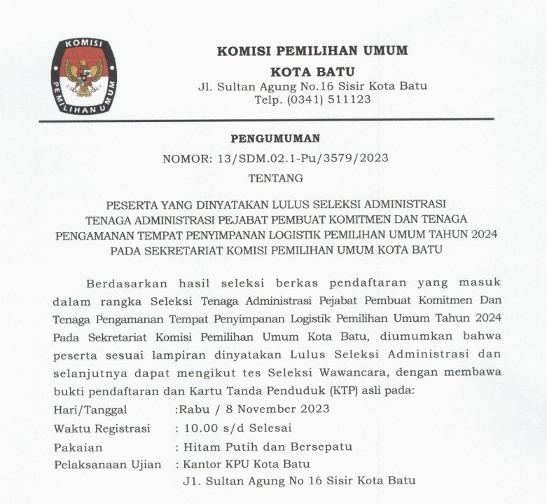 1. Pengumuman Nomor 337 tentang Daftar Calon Tetap Anggota DPRD Kota Batu dalam Pemilu Tahun 2024