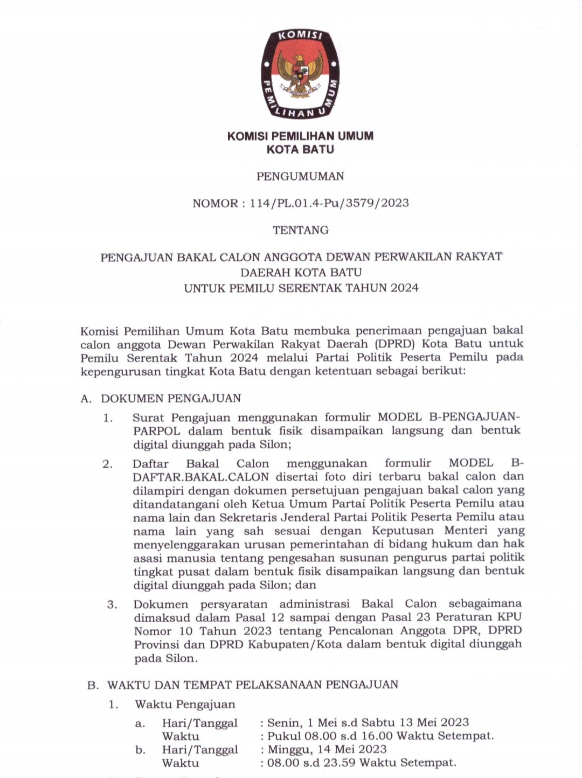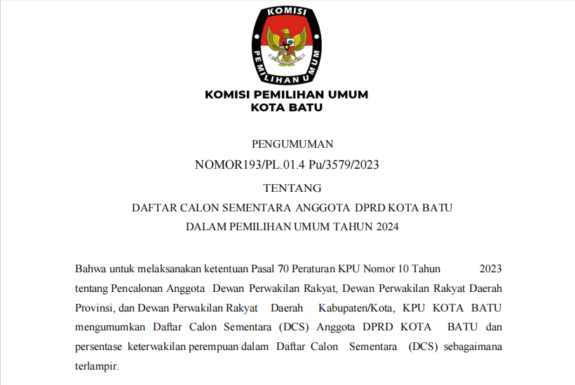 1. Pengumuman Nomor 193 tentang Daftar Calon Sementara Anggota DPRD Kota Batu dalam Pemilu Tahun 2024