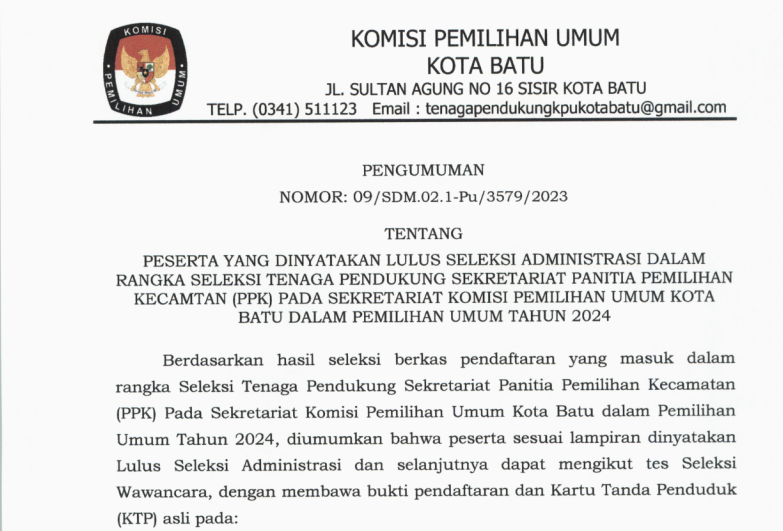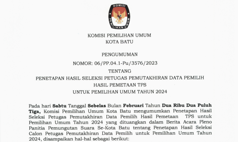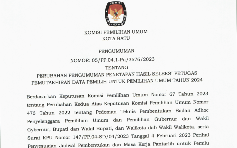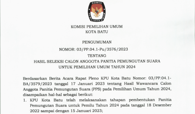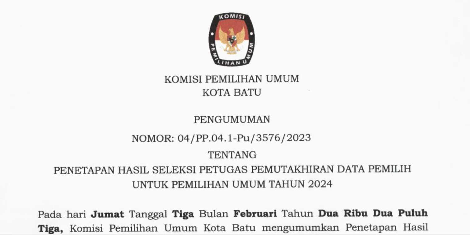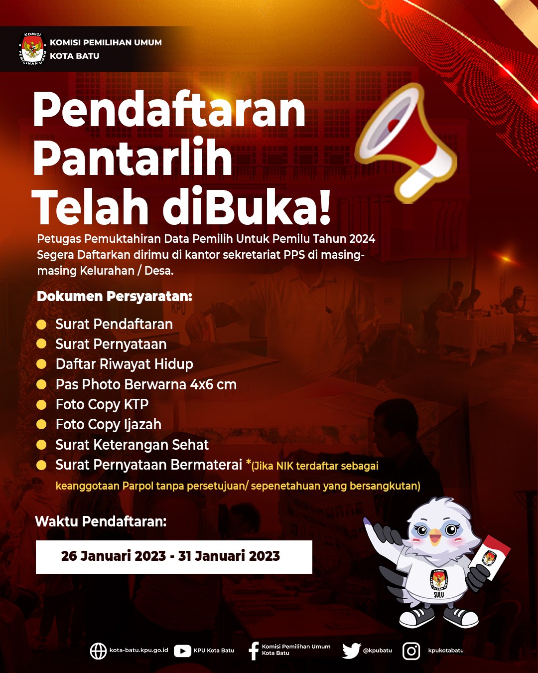 Untuk melaksanakan kegiatan pendaftaran dan pemutakhiran data Pemilih pada penyelenggaraan Pemilu Tahun 2024 di Kota Batu, KPU Kota Batu melalui seluruh Panitia Pemungutan Suara (PPS) di Desa/kelurahan akan segera membentuk Petugas Pemutakhiran Data Pemilih atau yang biasa disebut sebagai Pantarlih.