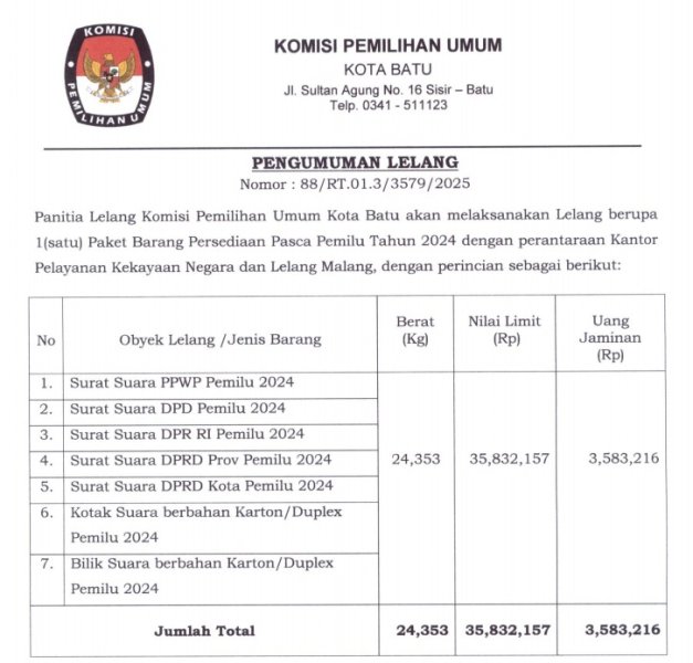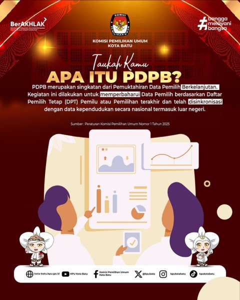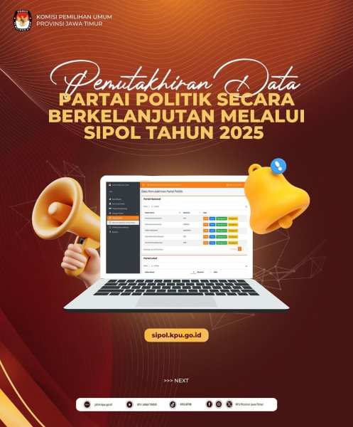 Surabaya, kota-batu.kpu.go.id - Guna mendukung data yang update dan akurat, KPU Provinsi Jawa Timur melakukan Pemutakhiran Data Partai Politik secara berkelanjutan melalui Sistem Informasi Partai Politik (SIPOL) tahun 2025. Ketentuan ini tertuang dalam Peraturan Komisi Pemilihan Umum Nomor 11 Tahun 2022 tentang Perubahan atas Peraturan Komisi Pemilihan Umum Nomor 4 Tahun 2022 tentang Pendaftaran, Verifikasi, dan Penetapan Partai Politik Peserta Pemilihan Umum Anggota Dewan Perwakilan Rakyat dan Dewan Perwakilan Rakyat Daerah, disebutkan Partai Politik dapat melakukan Pemutakhiran Data Partai Politik secara Berkelanjutan melalui Sipol Tahun 2025. Nah data-data yang perlu dimutakhirkan antara lain sebagai berikut: Kepengurusan Keterwakilan perempuan Keanggotaan Domisili kantor tetap Mari optimalkan proses pemutakhiran data partai politik secara berkelanjutan! Detail informasi dapat dilihat pada link berikut: https://kota-batu.kpu.go.id/public/kota-batu/dmdocument/1751533580_87116996dbb89890f3a1.pdf