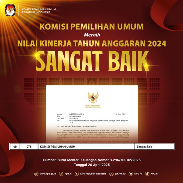 Jakarta, kota-batu.kpu.go.id – Komisi Pemilihan Umum (KPU) berhasil meraih kategori “Sangat Baik” dalam evaluasi Nilai Kinerja Anggaran (NKA) Tahun Anggaran 2024 yang disampaikan oleh Kementerian Keuangan pada surat Nomor : S-296/MK.02/2025, perihal Penyampaian Nilai Kinerja Anggaran Kementerian/Lembaga Tahun Anggaran 2024 tertanggal 26 April 2025. Prestasi ini menunjukkan bahwa KPU mampu mengelola anggaran dengan efektif, efisien, dan akuntabel dalam menjalankan tugasnya sebagai lembaga penyelenggara pemilu. Sebagai informasi, pemerintah melalui Kementerian Keuangan menyampaikan hasil evaluasi Nilai Kinerja Anggaran (NKA) Kementerian/Lembaga (K/L) untuk Tahun Anggaran 2024 yang menunjukkan capaian sangat baik secara nasional. Rata-rata NKA nasional mencapai 93,05, menandakan pengelolaan anggaran yang efektif, efisien, dan akuntabel sesuai prinsip good governance. Evaluasi yang dilakukan oleh Menteri Keuangan sebagai Bendahara Umum Negara ini mengukur kinerja anggaran berdasarkan dua aspek utama, yaitu perencanaan anggaran dan pelaksanaan anggaran, masing-masing memberikan kontribusi 50 persen terhadap nilai akhir. Nilai kinerja perencanaan anggaran mencapai 89,96, sementara nilai pelaksanaan anggaran berada di angka 96,14. Penilaian ini menggunakan indikator yang mencakup capaian sasaran strategis, efisiensi penggunaan standar biaya keluaran, serta penyerapan dan pengelolaan anggaran. Dalam surat resmi Menteri Keuangan Sri Mulyani Indrawati, KPU termasuk dalam daftar lembaga yang mendapatkan nilai NKA sangat baik, yang merupakan hasil penilaian menyeluruh terhadap perencanaan dan pelaksanaan anggaran. Penilaian ini mencakup capaian indikator kinerja sasaran strategis, efisiensi penggunaan anggaran, serta pengelolaan keuangan yang transparan dan akuntabel. “Kinerja anggaran yang baik ini menjadi bukti komitmen KPU dalam menjalankan amanah demokrasi dengan tata kelola keuangan yang profesional. Kami berharap capaian ini dapat terus dipertahankan dan ditingkatkan demi suksesnya penyelenggaraan pemilu yang berkualitas,” kata Ketua KPU, Mochammad Afifuddin. Menteri Keuangan, Sri Mulyani menekankan pentingnya seluruh kementerian dan lembaga, termasuk KPU, untuk menjadikan NKA sebagai indikator kinerja utama dan terus meningkatkan validitas data serta pengawasan anggaran, karena pengelolaan anggaran yang baik adalah fondasi utama untuk mewujudkan pemerintahan yang efektif dan akuntabel. Menteri Keuangan Sri Mulyani Indrawati menegaskan pentingnya hasil evaluasi ini sebagai tolok ukur utama dalam pengelolaan anggaran di setiap unit kerja K/L. Menurut dia, Nilai Kinerja Anggaran harus dijadikan Indikator Kinerja Utama (IKU) untuk memastikan perencanaan dan pelaksanaan anggaran berjalan dengan baik, transparan, dan bertanggung jawab. Hasil evaluasi ini diharapkan menjadi motivasi bagi seluruh instansi untuk terus memperbaiki tata kelola anggaran demi kemajuan bangsa.