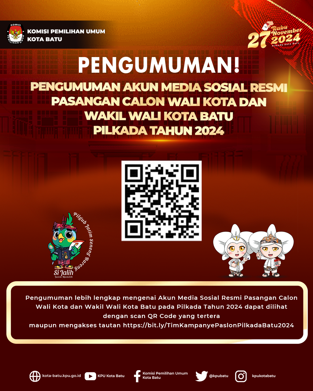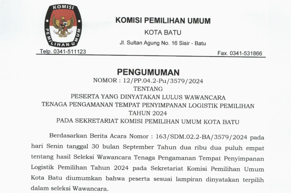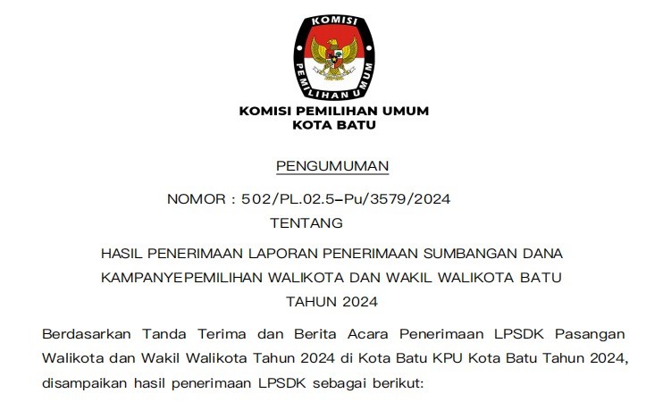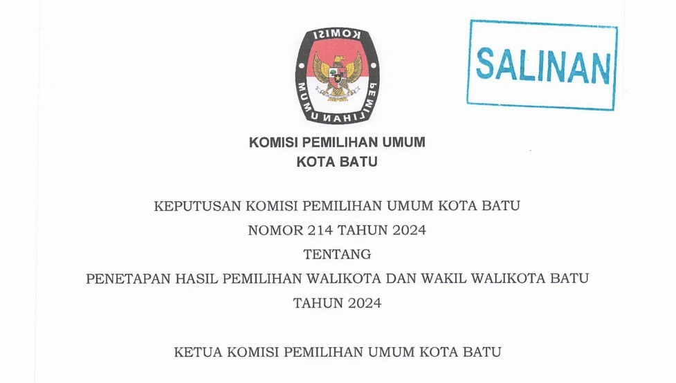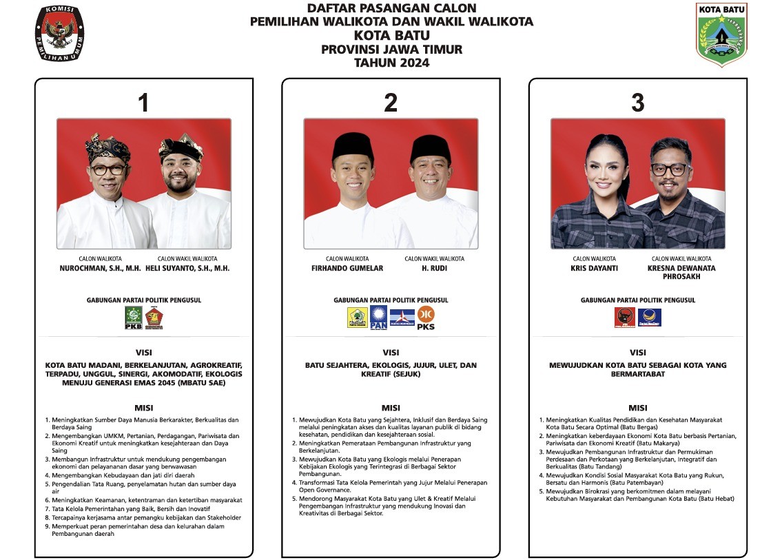 Batu, kota-batu.kpu.go.id - KPU Kota Batu telah menyelenggarakan Rapat Pleno Rekapitulasi Hasil Penghitungan Perolehan Suara dalam Pemilihan Gubernur dan Wakil Gubernur serta Walikota dan Wakil Walikota Tingkat Kota Batu pada Pemilihan Tahun 2024, Senin (2/12/2024). Rekapitulasi hasil penghitungan di tingkat kota ini merupakan lanjutan dari rekapitulasi berjenjang yang telah dilakukan dari tingkat TPS hingga kecamatan pada periode 27 November hingga 1 Desember 2024 lalu. Secara teknis, rapat pleno diawali dengan pembacaan tata tertib oleh KPU Kota Batu. Pelaksanaan jalannya rekapitulasi dipimpin oleh Anggota KPU Kota Batu Divisi Teknis Penyelenggaraan, Thomi Rusy Diantoro. Secara bergantian PPK Batu, Bumiaji, dan Junrejo membacakan hasil rekapitulasi yang telah tuntas di masing-masing kecamatan. Hasil dari Rekapitulasi Hasil Penghitungan Perolehan Suara Tingkat Kota Batu untuk Pemilihan Walikota dan Wakil Walikota Batu adalah sebagai berikut: - Paslon Nomor Urut 1 Nurochman, S.H., M.H. dan Heli Suyanto, S.H., M.H. memperoleh suara sah sebanyak 65.684 - Paslon Nomor Urut 2 Firhando Gumelar dan H. Rudi memperoleh suara sah sebanyak 38.610 - Paslon Nomor Urut 3 Kris Dayanti dan Kresna Dewanata Phrosakh memperoleh suara sah sebanyak 26.234 Detail pengumuman tersebut tertuang dalam Keputusan KPU Nomor 214 tahun 2024 tentang Penetapan Hasil Pemilihan Walikota dan Wakil Walikota Batu Tahun 2024 berikut: https://bit.ly/PenetapanHasilPilkadaBatu2024